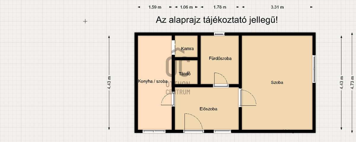 Eredetileg egy szoba, konyha, fürdőszoba, WC, előszoba volt kialakítva, jelenleg két szoba fürdő+WC, előszobaként van használatban.