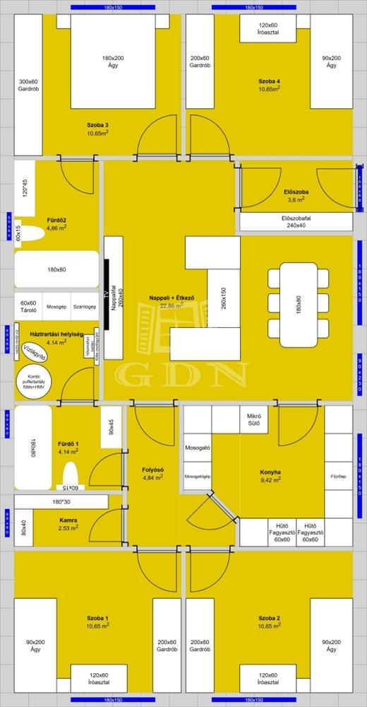 Tervezett elosztás: 4 hálószoba, amerikai konyhás nappali, 2 fürdőszoba, ablakos kamra