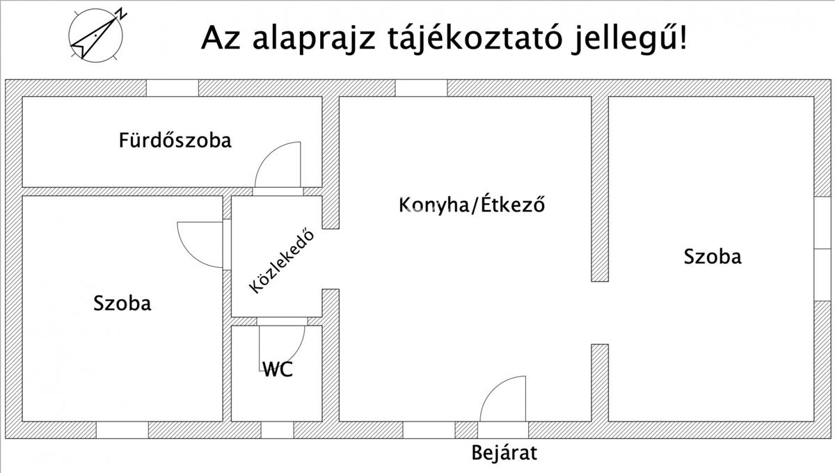 - Az egy szintes ingatlanba található: előszoba/konyha/étkező, 2 szoba, fürdőszoba, WC