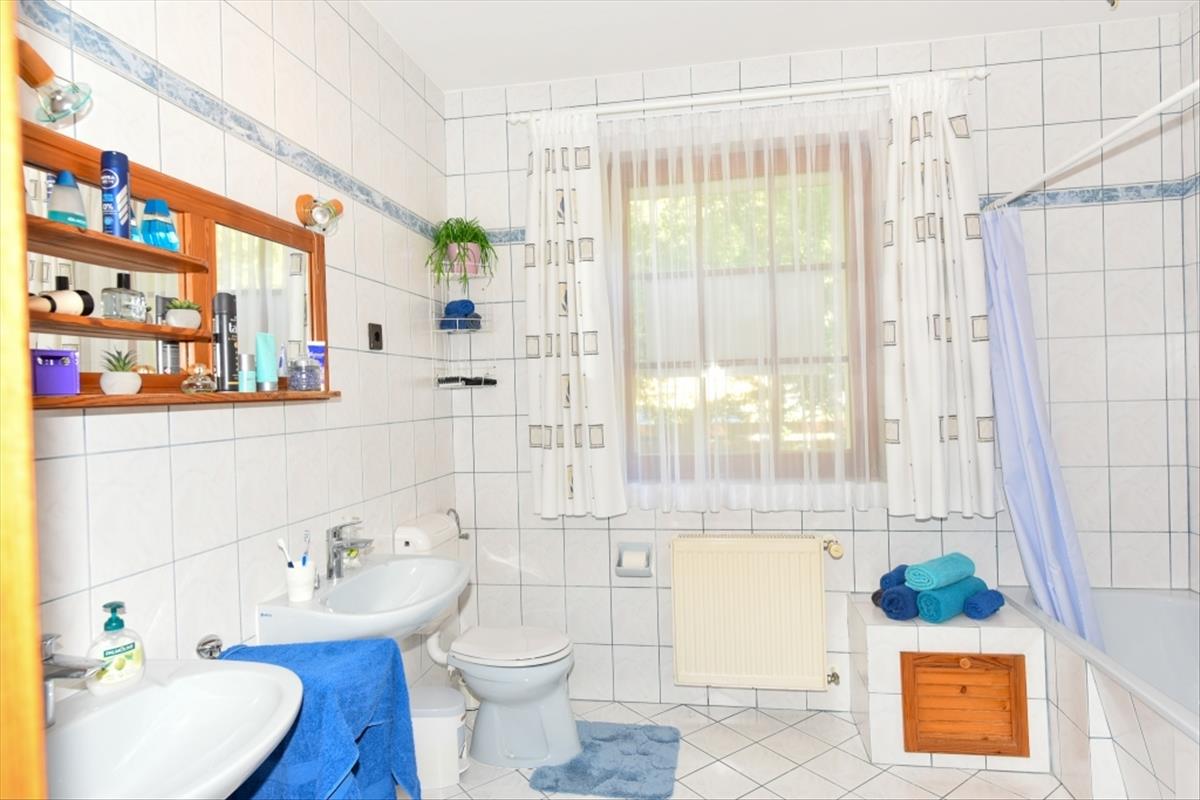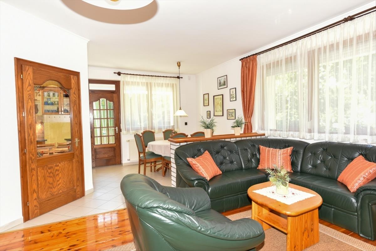 A ház nagy előnye a földszinten található hatalmas nappali-étkező, amelyből közvetlen a teraszra láphetünk ki. a teraszról a fenyőfákkal beültetett gondozott udvar tárul elénk, melynek végében elkerített veteményeskert, bő vízű kút automata öntözőrendszerrel található.