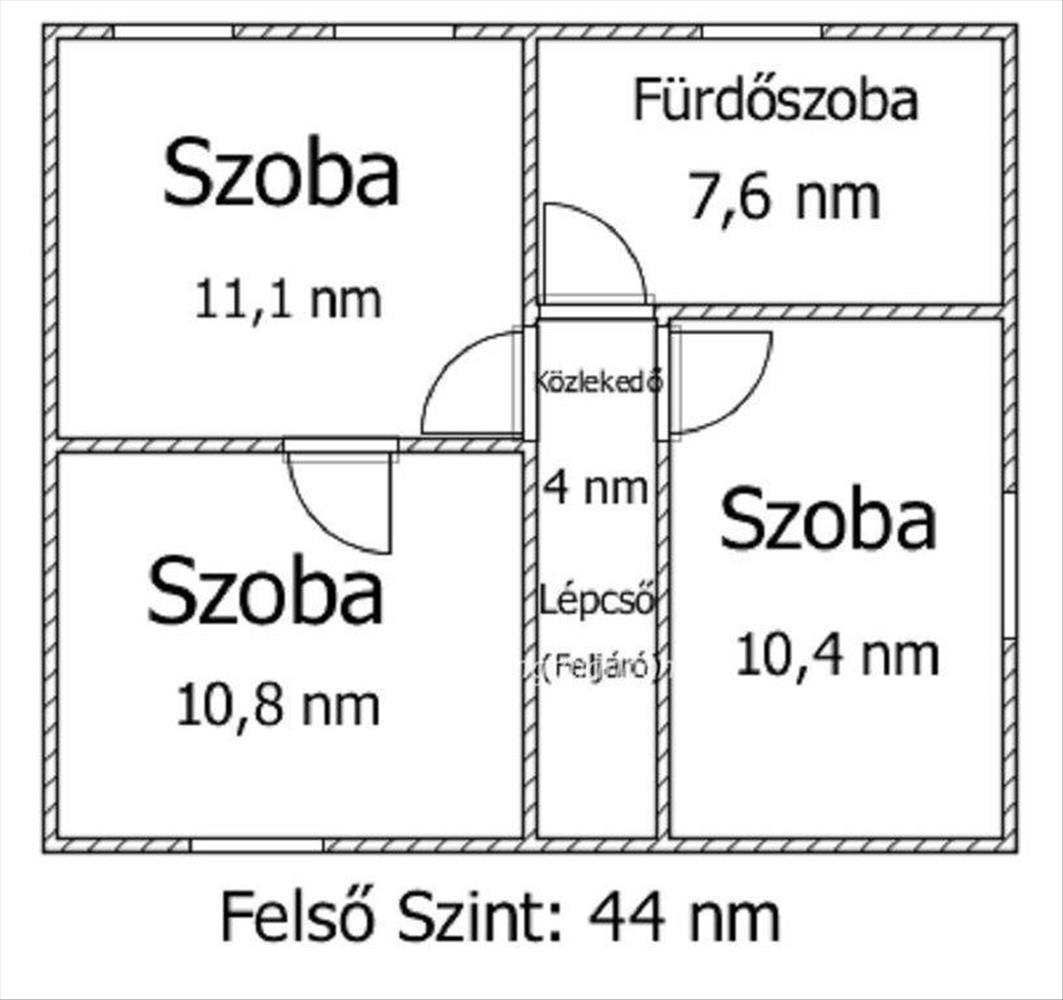 Felső szinten egy közlekedő, egy fürdőszoba valamint három szoba kapott helyet.