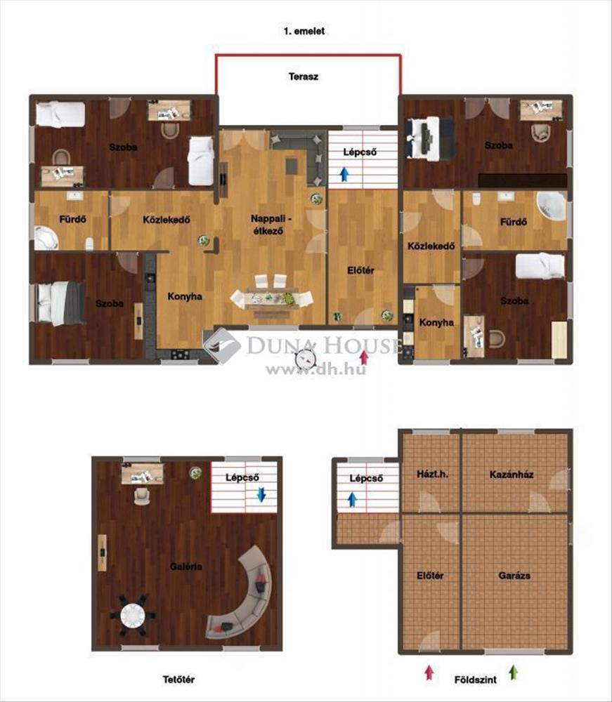 - Földszint: előtér, garázs, kazánház, háztartási helyiség, lépcsőház