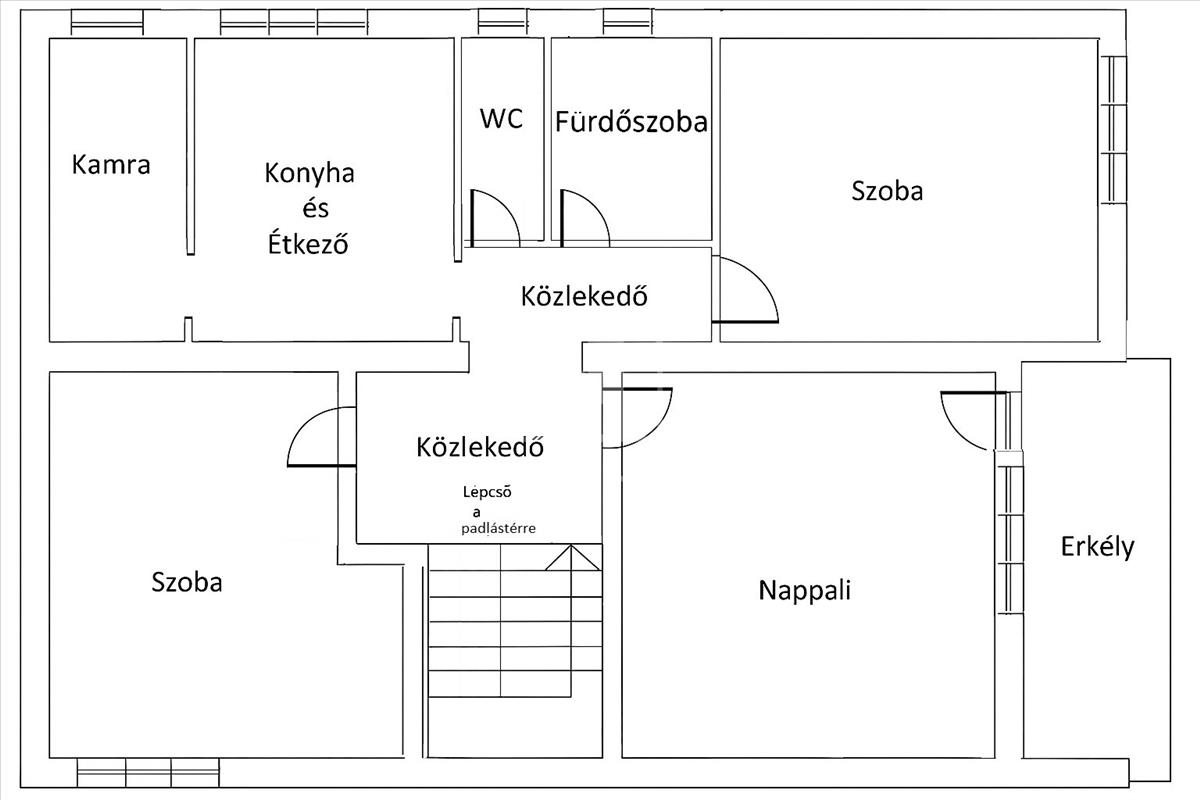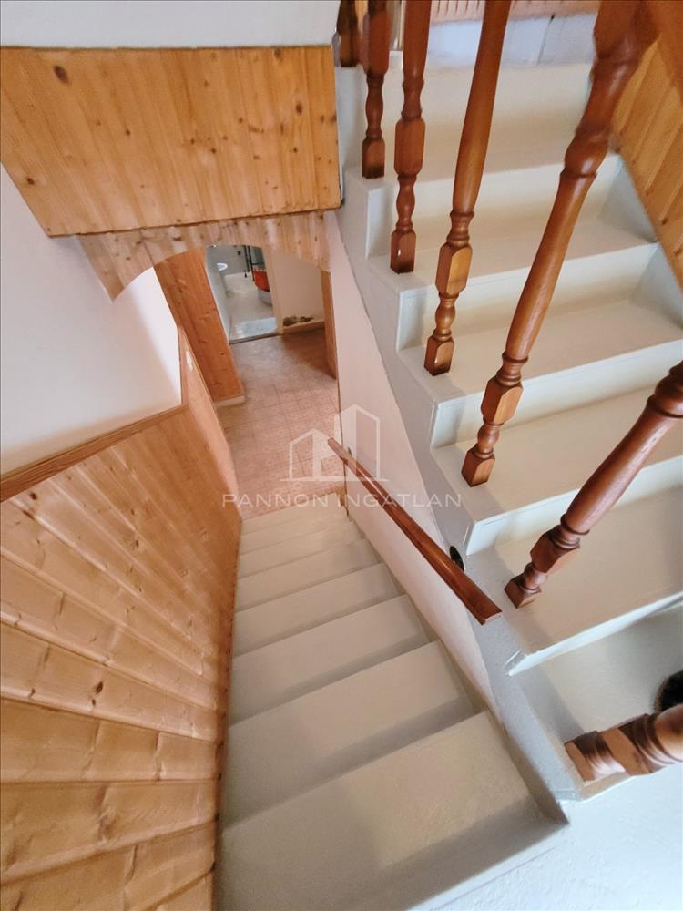 Majd egy lépcsőn át jutunk fel az emeleti részre, ahol 2 szoba, egy nappali erkéllyel, konyha és étkező, kamra, káddal ellátott fürdőszoba, külön helyiségben lévő wc található. Innen egy további lépcsősor vezet fel a padlástérre, ami erkéllyel rendelkezik és BEÉPÍTHETŐ.