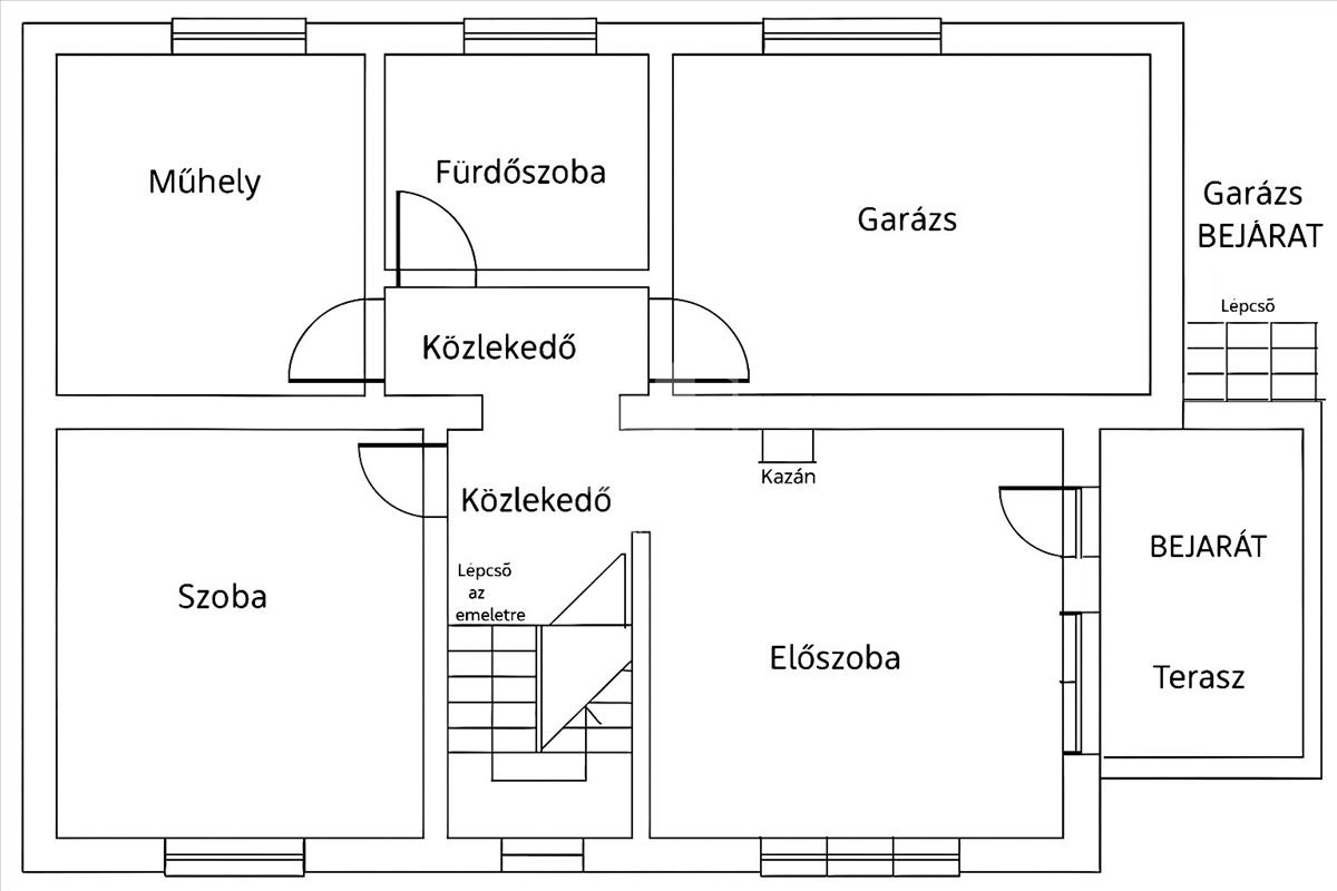 A lakóház három szintes, melynek jelenlegi elosztása a földszinten: a 12, 5 m2-es teraszról jutunk be az előszobába (adott esetben átalakítható) és itt kapott helyet a gázkazán, valamint itt található még, egy zuhanykabinnal és wc-vel ellátott fürdőszoba, (mosókonyhaként is használható, mert itt kapott helyet a mosógép), és 2 szoba, ami közül az egyik műhelyként funkcionál jelenleg. Ezen a szinten került kialakításra, az 1 állásos garázs (20 m2), ami kényelmesen a házon belülről is megközelíthető.