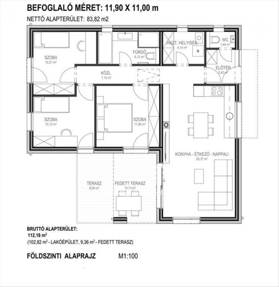 Újépítésű lakóház eladó, Győr-Moson-Sopron Vármegye Vitnyég községben. a fűtéskész állapotú típusházunk kompakt, mégis jól kihasználható elrendezésének köszönhetően ideális választás kisebb családok vagy fiatal párok számára.A ház bruttó 114, 13 nm beépített területtel és nettó 83, 82 nm hasznos alapterülettel rendelkezik, nappali + 3 szobás kialakítással.