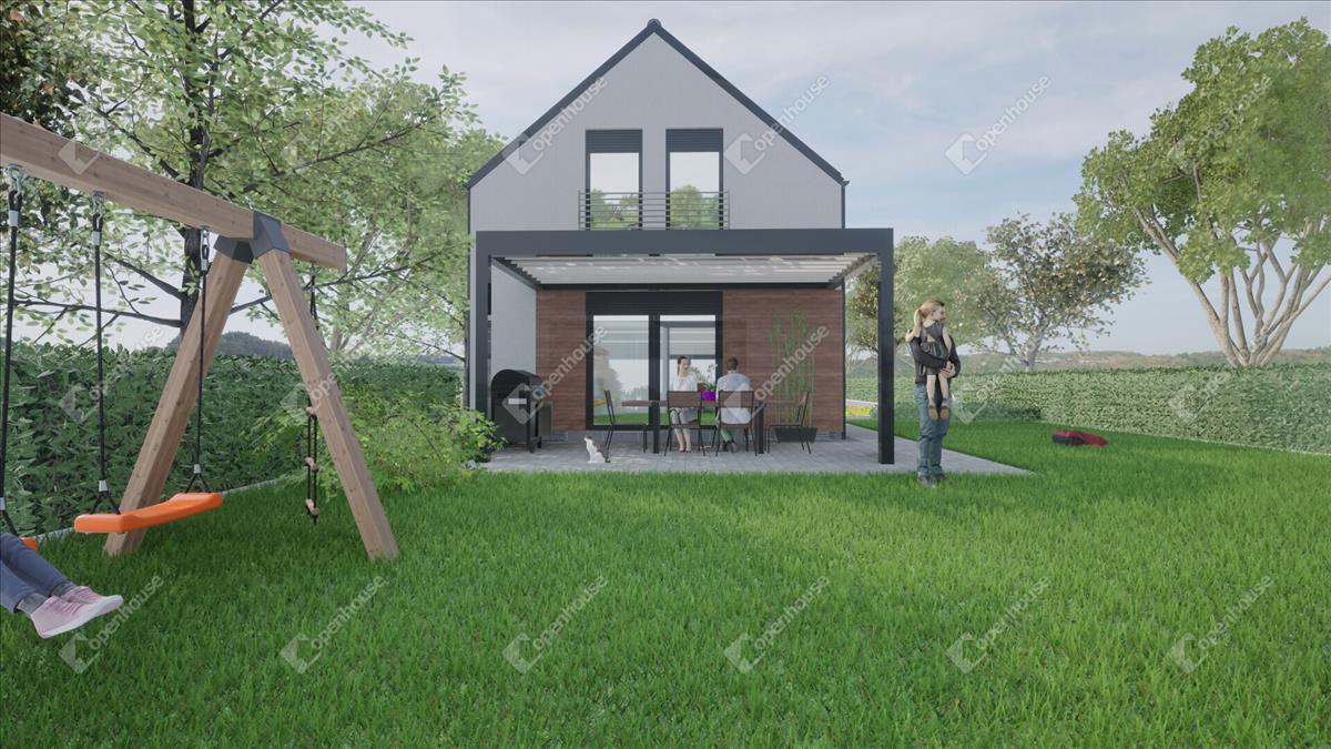 A homlokzatok modern kialakításúak, fehér színű homlokzati vakolat, antracit színű cserépfedés, hőszigetelt műanyag nyílászárók antracit színben, és fa homlokzati burkolat. a külső, és belső burkolatok igény szerint módosíthatóak.