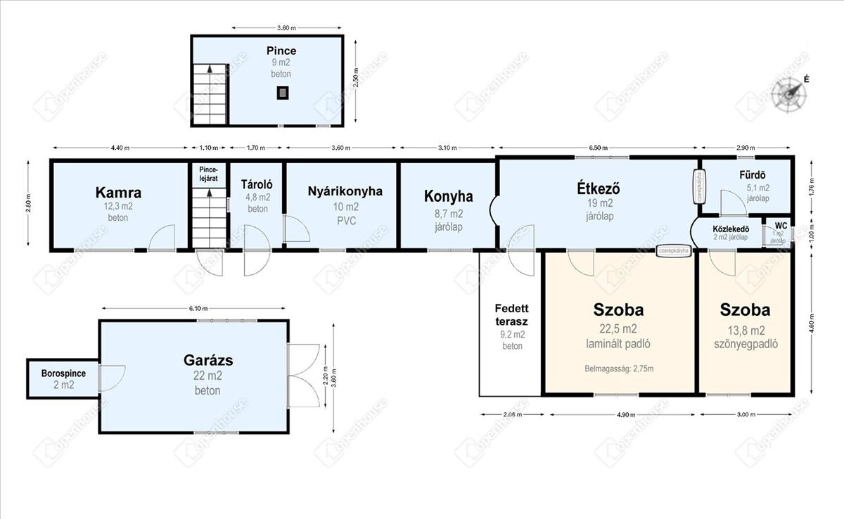 - összesen 99 m2 hasznos terület: a főépület 72 m2 folytatásaként több mellékhelyiség is megtalálható, összesen 27 m2, úgymint: nyárikonyha, kamra, tároló alatta egy 9 m2-es tágas, száraz pincével
