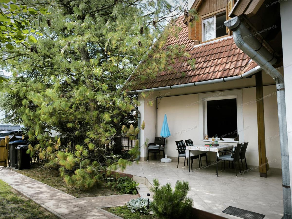 A gondosan karbantartott kertben térköves járda, tágas árnyékos terasz, valamint egy hangulatos kerti játék sarok is helyet kapott.