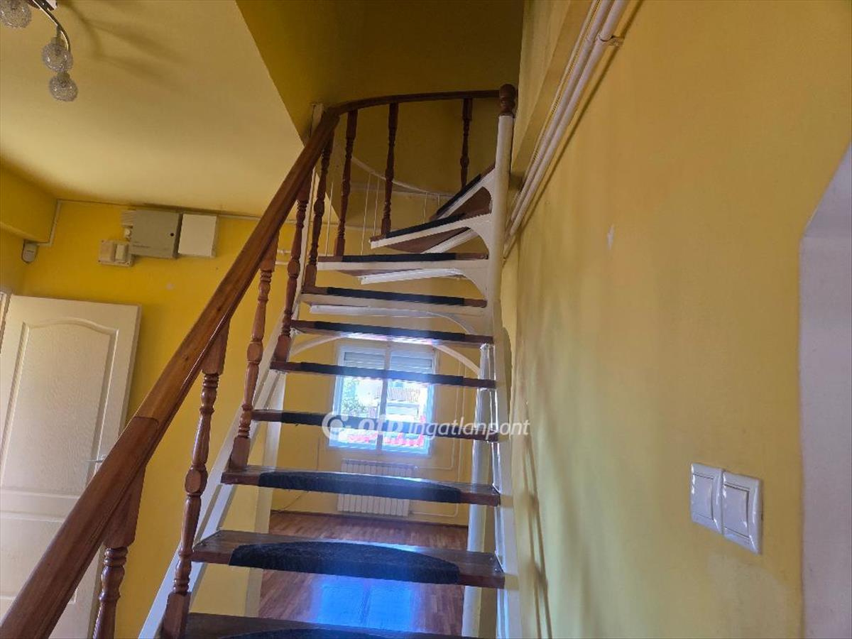 A földszinten található egy nagy nappali, 1 gardróbnak vagy hálószobának is használható szoba, étkező, konyha beépített konyha bútorral, kis kamrával. Az alsó szinten szépen felújított fürdőszoba van, egyedileg készítetett bútorral, külön wc. a fűtést és a melegvizet egy szinte teljesen új bosch gázkazán biztosítja.