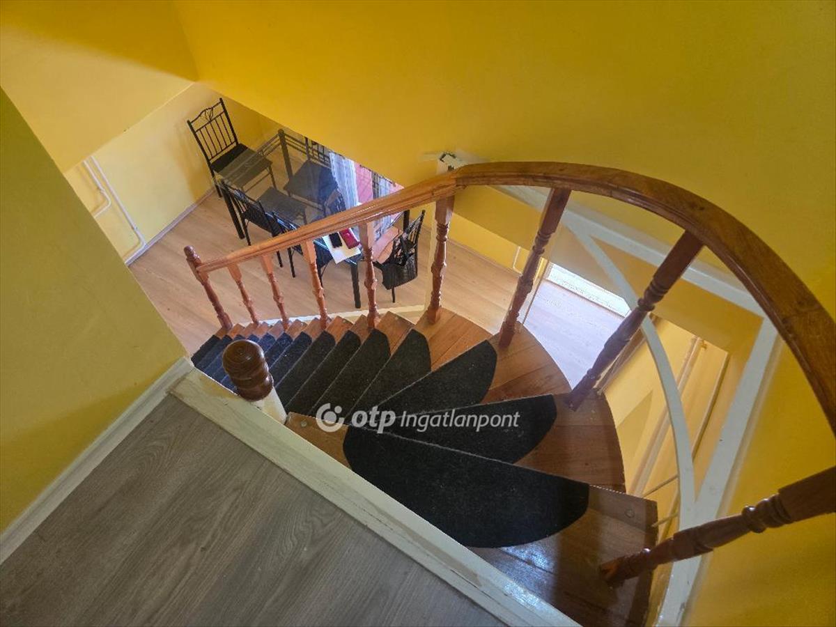 Az emeletet szépen faragott fa lépcső köti össze az alsó szinttel. Az ingatlanban kamera rendszer is ki lett építve!