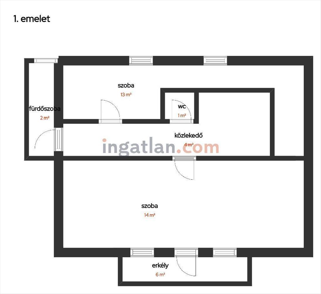 A fenti szinten kialakításra került egy nagy szoba erkéllyel mely az utcafrontra néz.