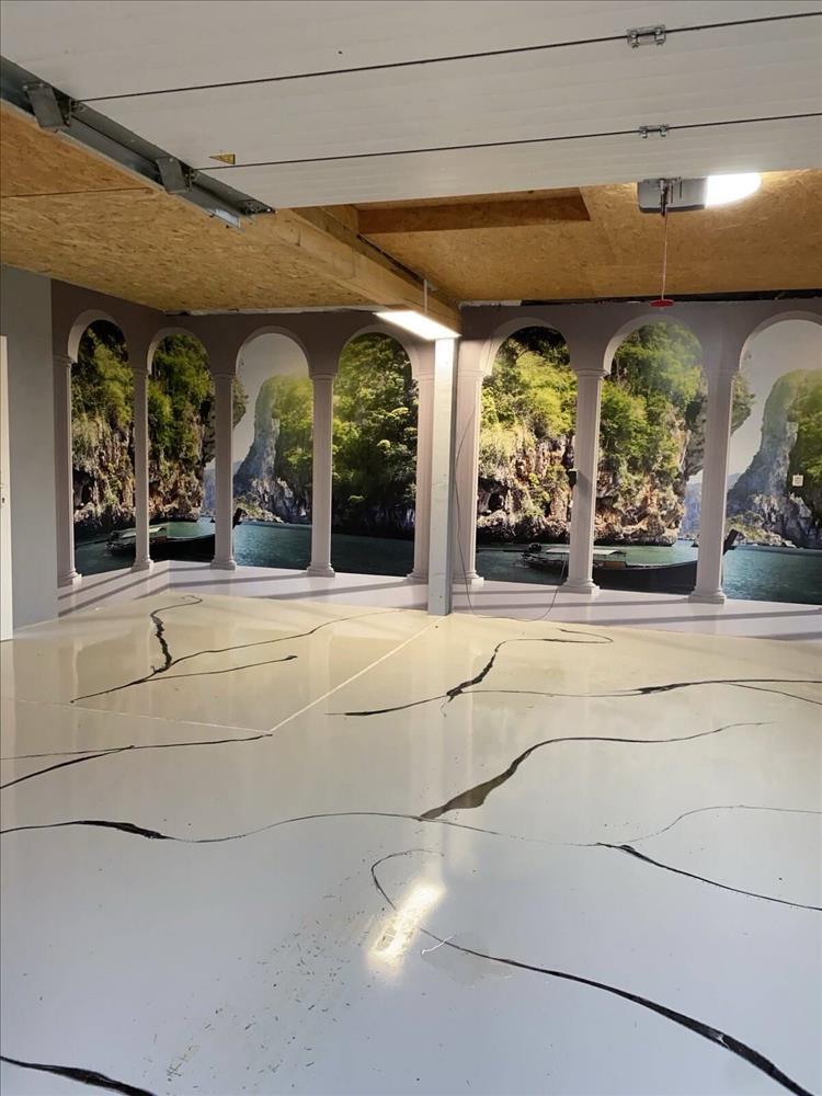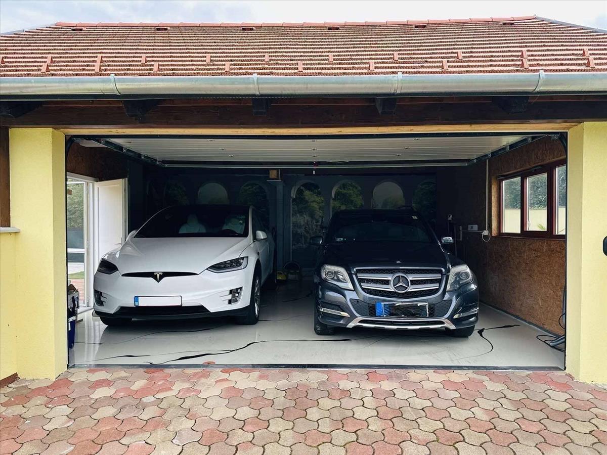 A garázs 40 nm -es, két autó is könnyedén elfér benne, Tesla töltővel felszerelt.