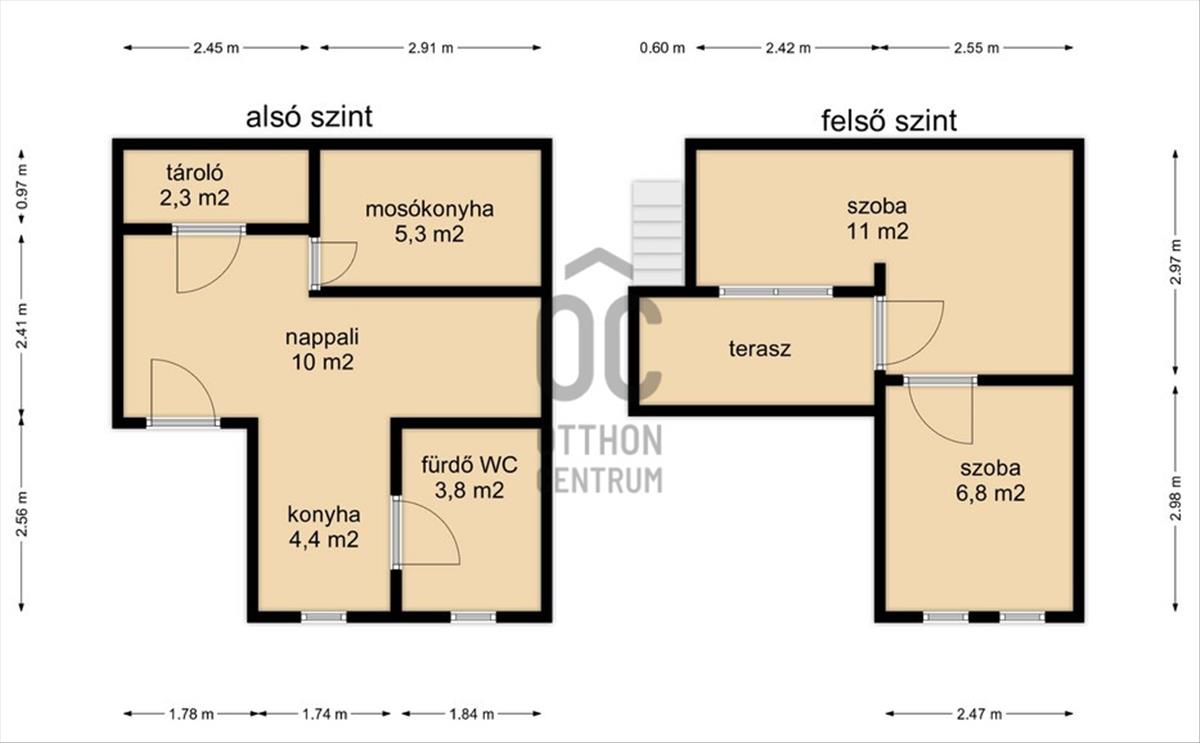- a jó állapotú 44 m2-es ház felső szintjén két és fél szoba kapott helyet a felső szint külső lépcsőn közelíthető meg.