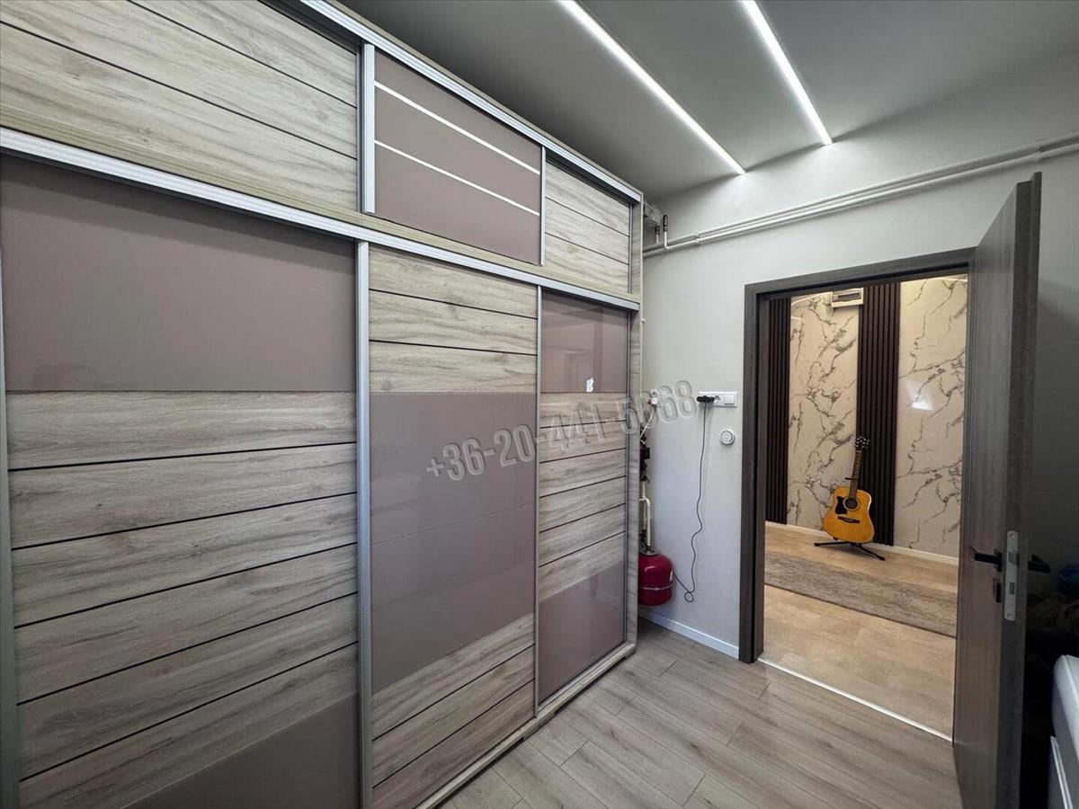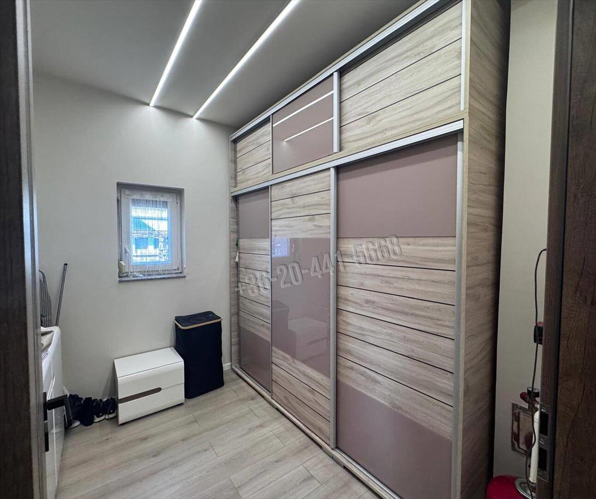 A külön gardrób helyiség új, tolóajtós beépített szekrényekkel még praktikusabbá teszi a mindennapokat.