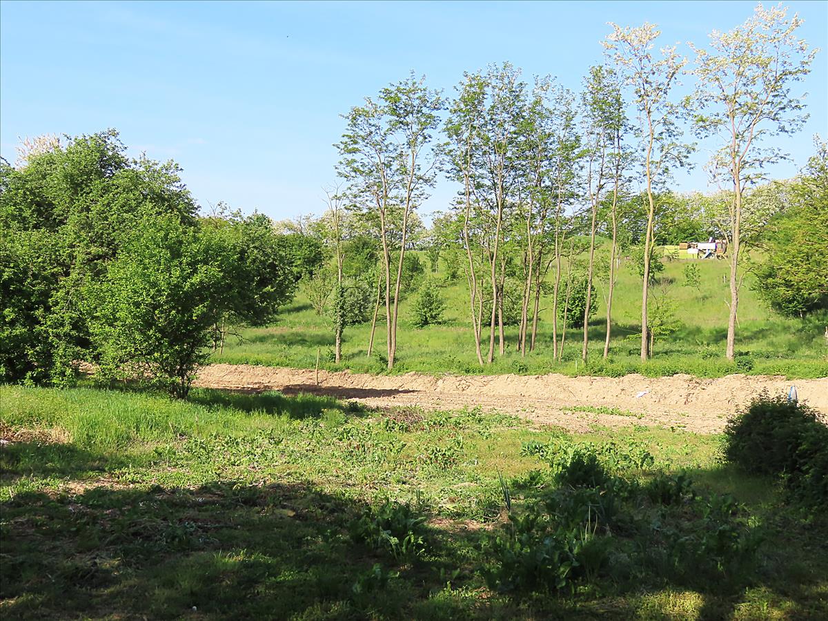 Az udvar sík, nagyrészt pázsittal borított, rajta dísz bokrok, virágok, gyümölcsfák (cseresznye, dió, birsalma) és egy ásott kút található, ebből szivattyú segítségével megoldható a növények öntözése. a telek méretének köszönhetően nagyobb konyhakert is kialakítható rajta, illetve további gyümölcsfák is ültethetők, így akár gazdálkodásra is alkalmas.