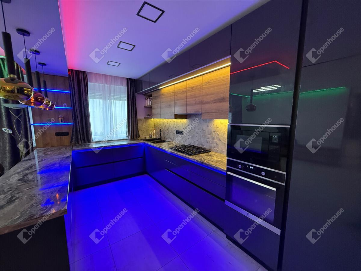 A modern, magas fényű, gépesített konyhabútor minden igényt kielégít, az okos térszervezésnek és minőségi anyagoknak köszönhetően a helyiség a luxus és funkcionalitás tökéletes harmóniáját nyújtja.