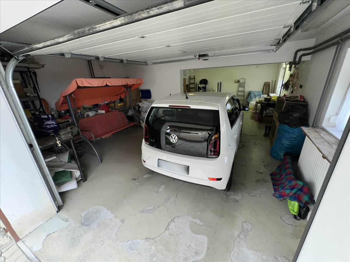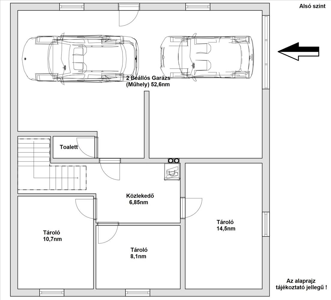 Négy külön helyiség található, a garázsba akár két autó is elfér. Három külön nyíló, ablakos tároló kapott helyet, melyből az egyik borospinceként szolgált, valamint egy külön nyíló toalett. Igény esetén az alsó rész még alakítható, akár szobát/konditermet/pihenőszobát is ki lehet alakítani a tárolók helyett.