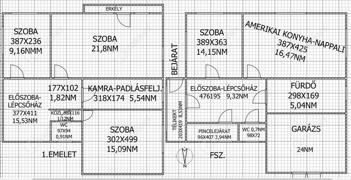 Emelet: három tágas szoba, kamra, külön wc, lépcsőház–előszoba.
