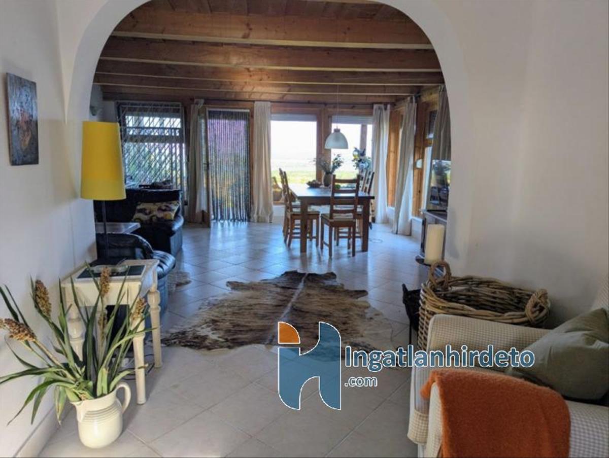 Das Wohnhaus betritt man über eine Treppe und kommt über den Eingangsbereich in ein offenes Wohn-Esszimmer mit Küche. Bodentiefe Fenster machen diesen Raum hell und ermöglichen einen herrlichen Rundumblick in den Garten und auf den See. Vor dem Wohnbereich befindet sich ein Balkon, auf dem Sie bei einer Tasse Kaffee den faszinierenden Panoramablick auf eines der schönsten Naturschutzgebiete Ungarns, den Kis-Balaton, genießen können. Für Frühaufsteher gibt es wohl keinen schöneren Platz als diesen, um der Sonne beim Aufgehen zuzuschauen. Auf gleicher Ebene befindet sich das Schlafzimmer, ein modernes Bad mit Dusche (erneuert 2024) und ein separates wc.