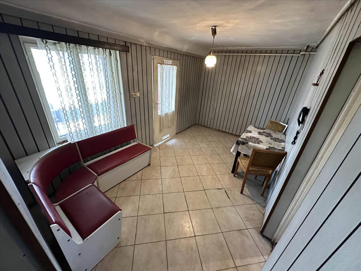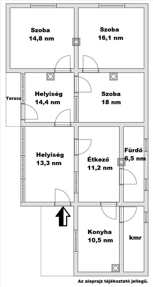 A bejárati ajtón lépve egy tágas helyiségbe lépve közelíthetjük meg a többi helyiséget, így jelenlegi elosztása is jónak mondható. Az eredeti épületet kibővítették egy kisebb terasszal, egy kisebb asztal és néhány szék is kényelmesen elfér.