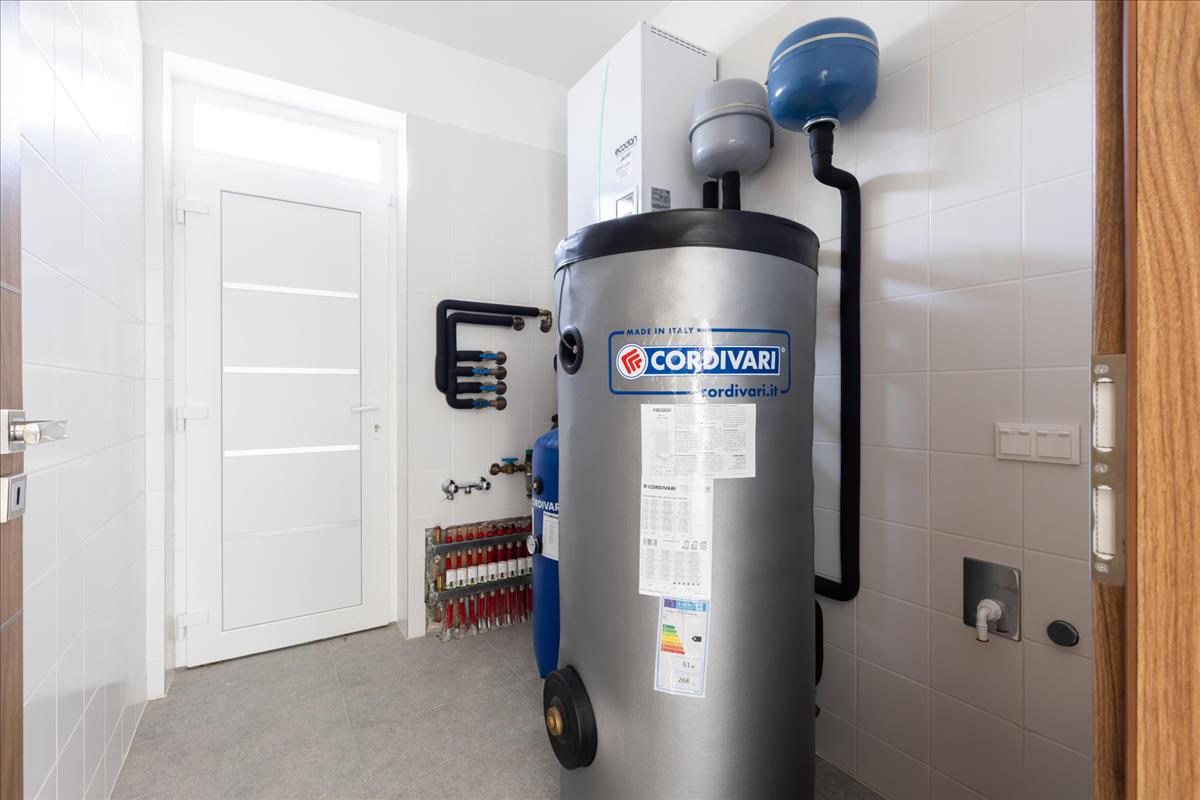 A házban víz/levegő hőszivattyús hűtő-fűtő rendszer van kiépítve.
