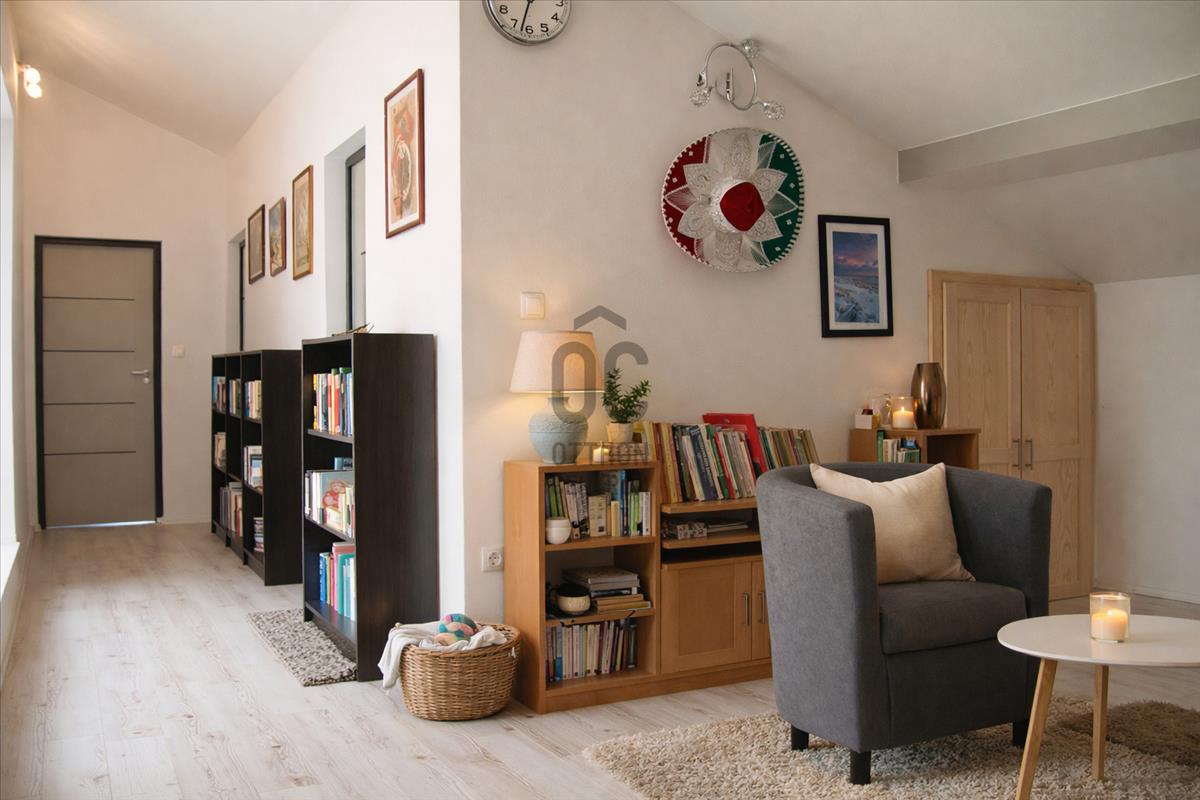 Emelet: 2 extra méretű hálószoba (osztható), fürdőszoba WC-vel, külön wc, társalgó, óriás tárolóhelyiség, kisebb szoba, napozóterasz.