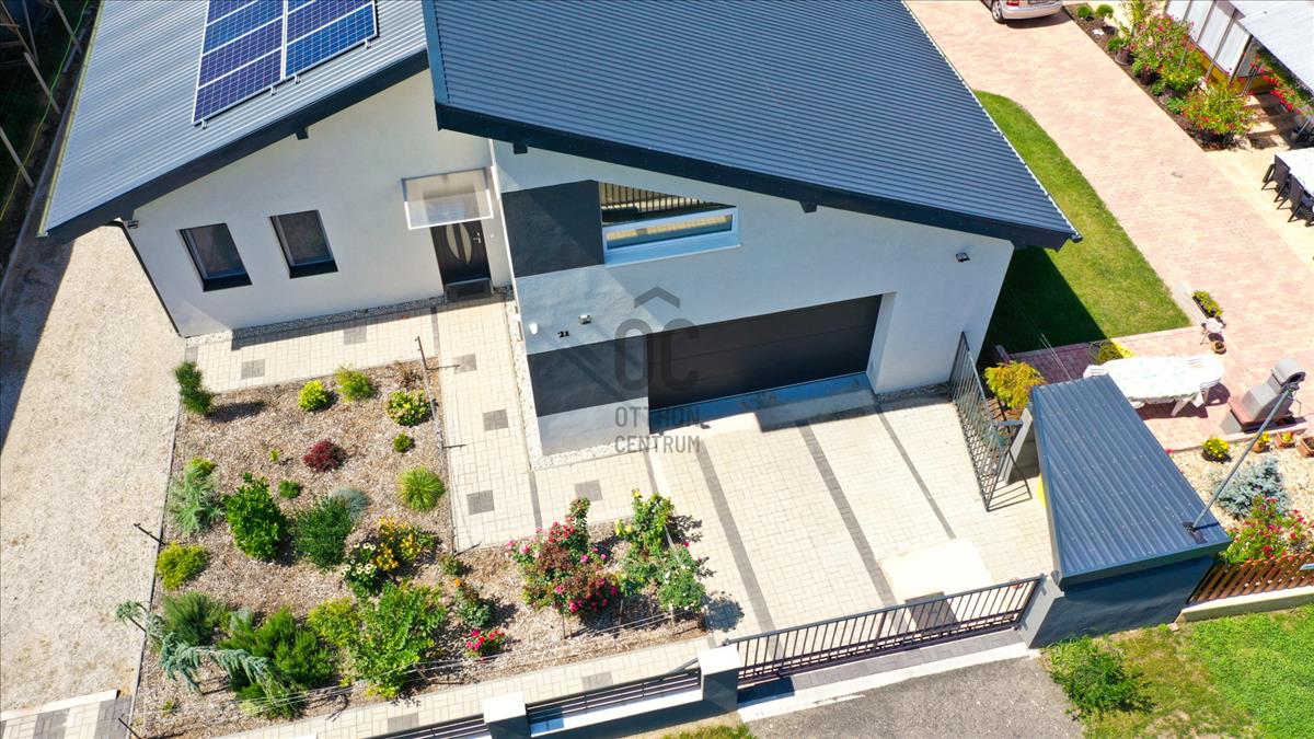 A tetőn elhelyezett napelemek a fenntarthatóságot, a modern technológiát és a jövőbe mutató gondolkodást jelképezik – a luxus itt nem puszta látvány, hanem tudatos választás.
