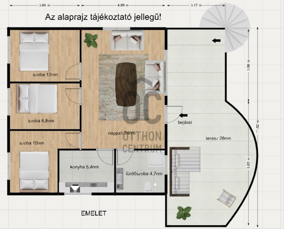 -emelet külső lépcsőn megközelíthető, 67nm-es, hatalmas panorámás terasz, nappali, konyha, fürdőszoba és 3 hálószoba