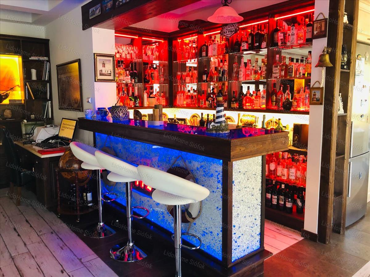 Az ingatlan modern stílusban lett kivitelezve te extrákkal köztük rengeteg hangulatos világítással amik sok helyen megtalálhatók akár a bárpultban vagy a plafonon és még a képek mögött is.