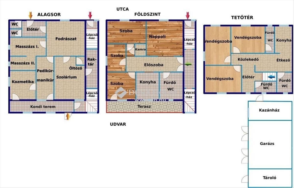 Zirc központjához közel, de mégis egy csendes, erdőhöz közeli utcában eladó egy összesen 313 nm-es, három szintes lakóházat, vendégházat és szépségipari szolgáltató egységet magába foglaló társasház, 800 nm-es telken.