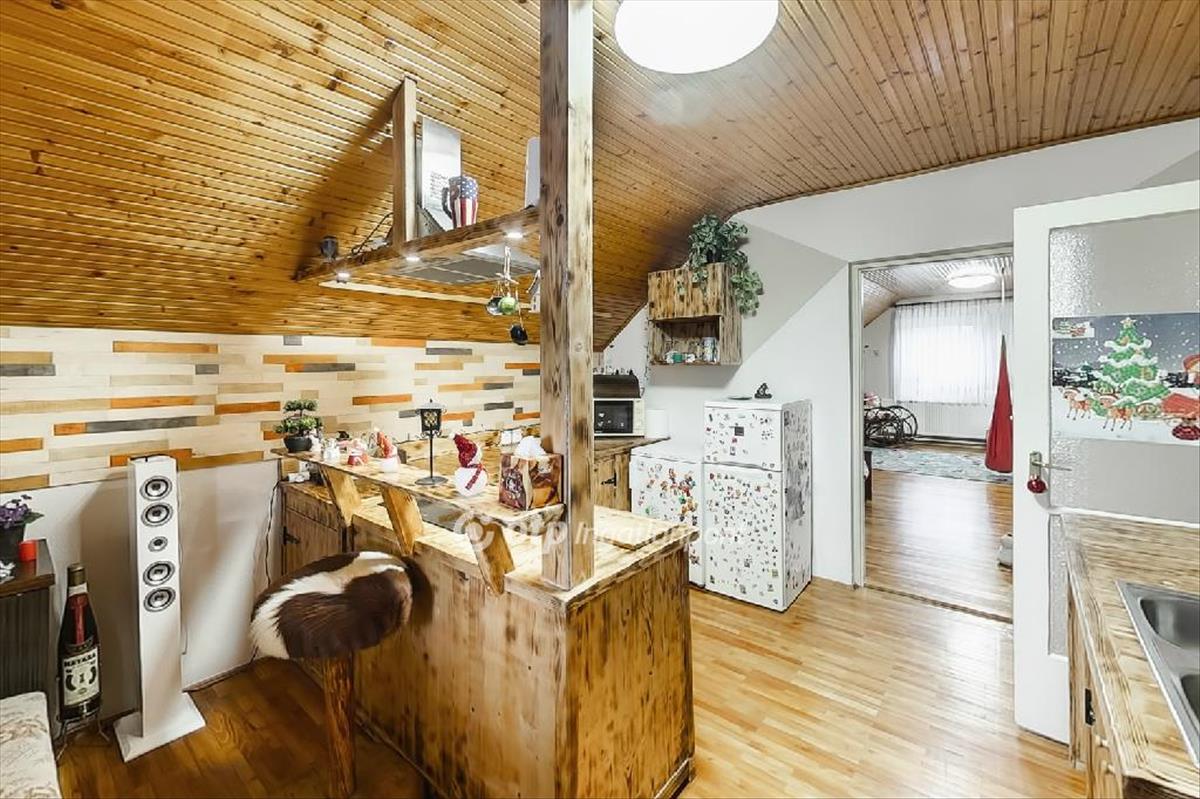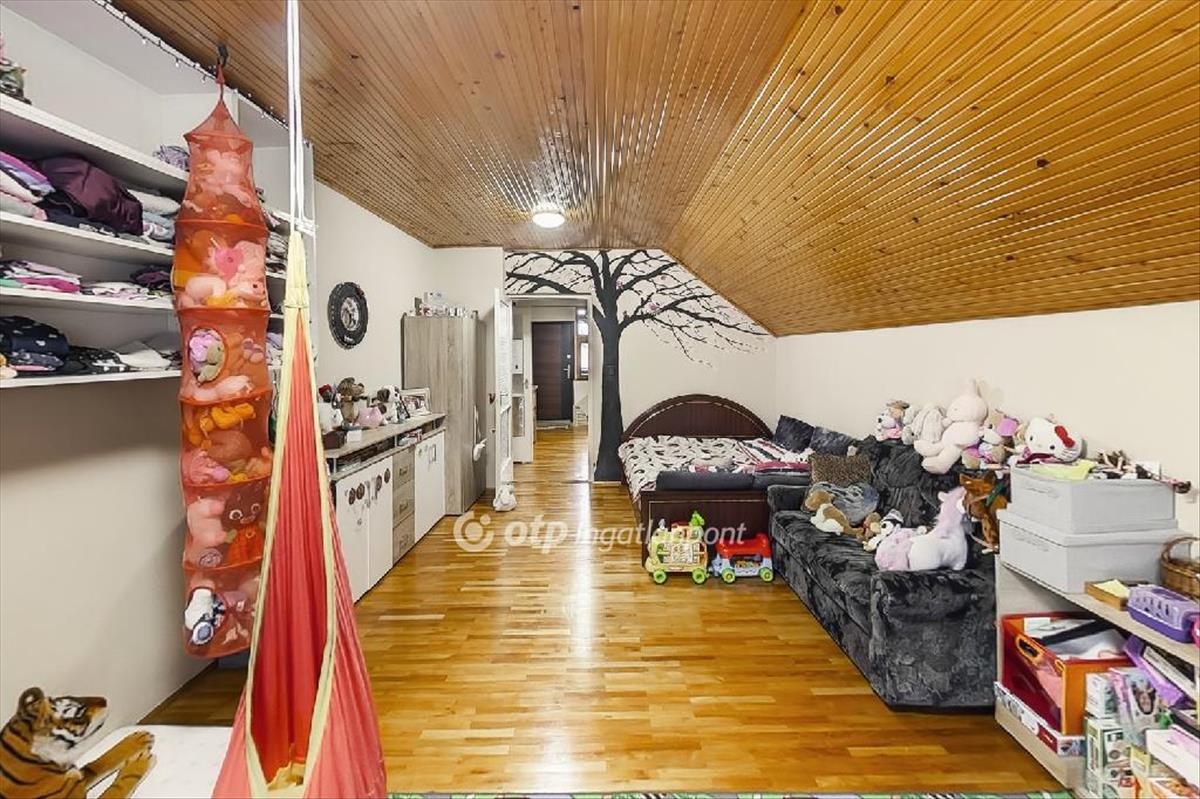Az emeletre a tetőtérbe, külső és belső lépcsőn is fel lehet jutni ez a lakrész 83m2. Ezen a szinten két hatalmas szoba, egy kisebb étkező, kádas fürdőszoba WC-vel és egy konyha található, mely igazi fa beépített konyhabútorral sajátos hangulattal rendelkezik. Ezen a szinten is mindkét irányban terasz található.