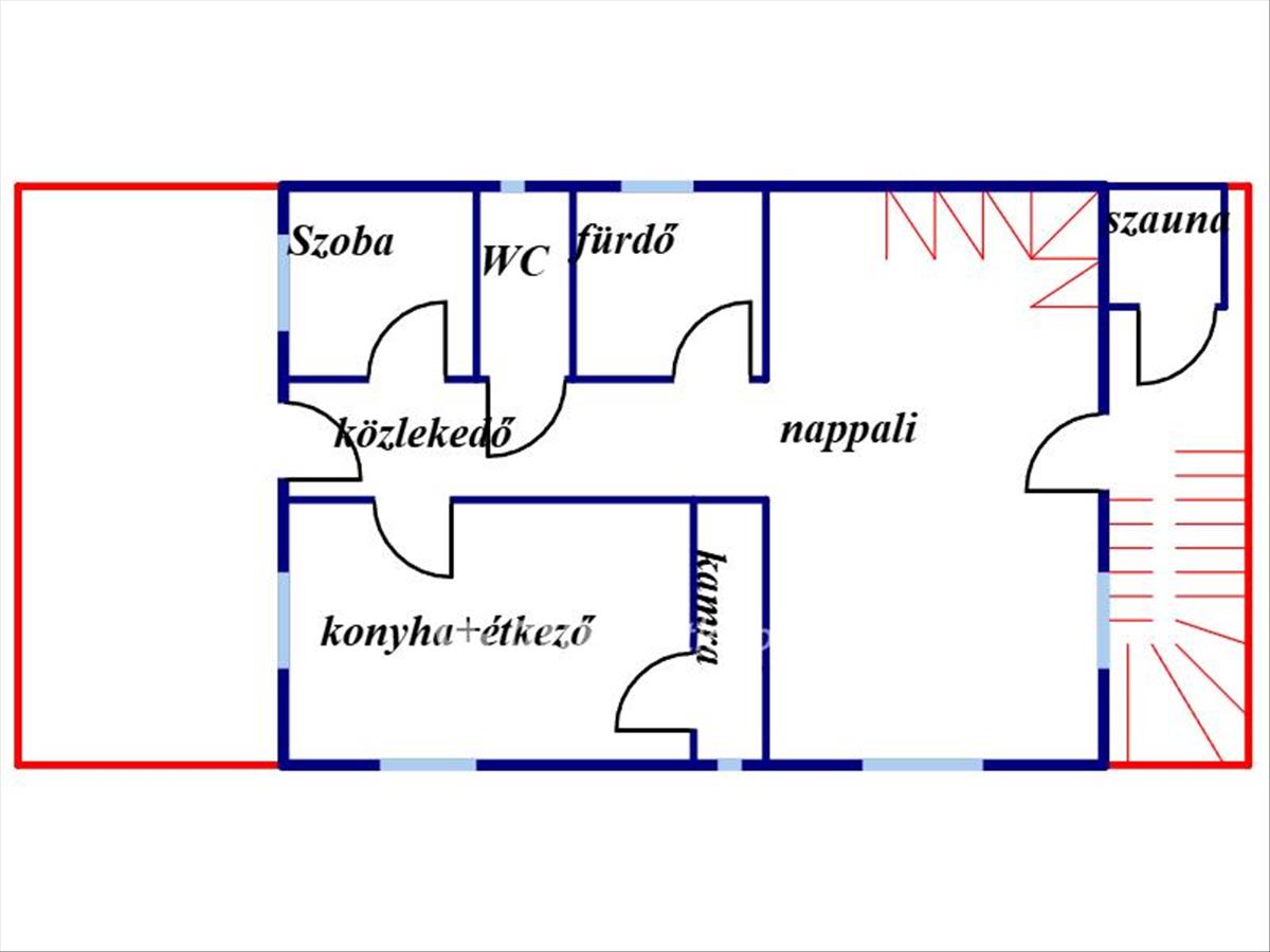 A földszinti lakásból, mely 89m2 két irányba nyílik terasz, az utca felé a főbejárat és az udvar felé, ahol egy szauna is megtalálható a teraszon egy zuhanyzóval. Ezen a szinten nappali, konyha-étkezővel, szoba, egy kádas fürdő, külön wc, és egy spájz.