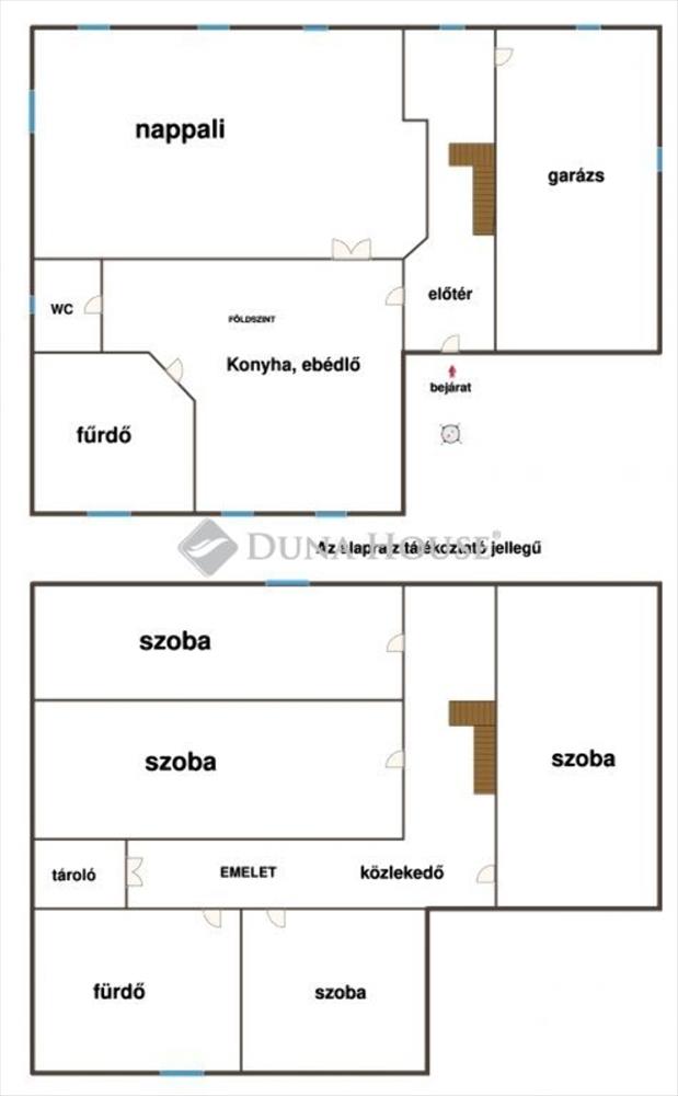 Emeleti helyiségek: 4 szoba, fürdő, tároló és közlekedő