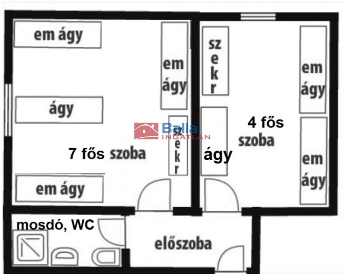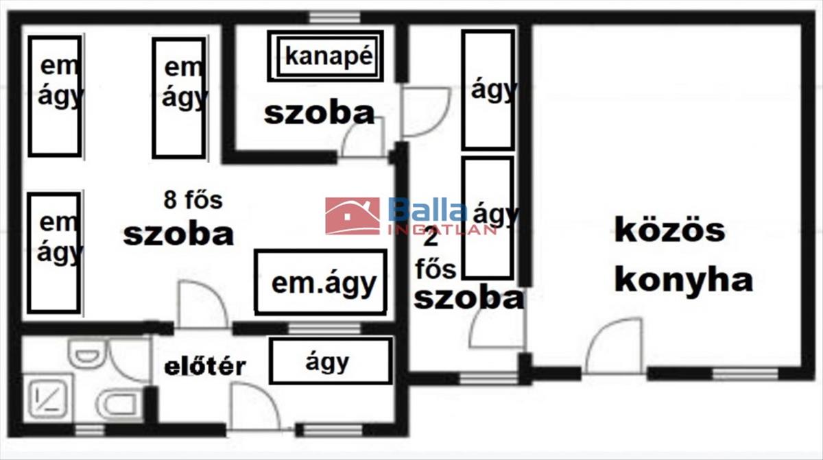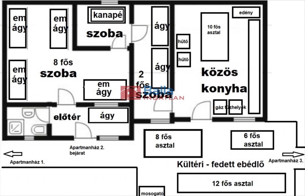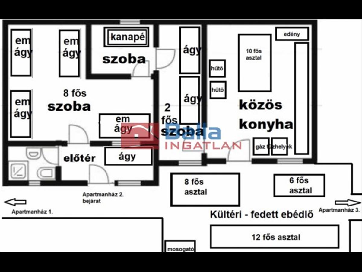 A 6561 m2 saját terület jó mozgásteret biztosít a sokoldalú felhasználásra. Jelenleg 3 db apartmanház, faház, közösségi terem nagy alapterület mellett fedett teraszokkal kiegészülve rossz időjárási körülmények között segít a szabadidős programok lebonyolításában. 10-15 Fős, emeletes ágyas (2-4-8 fős szobás), külön fürdőszobás kialakítással 50 fő elszállásolására alkalmas diáktáborként üzemel, 100 m2 alapterületű új közösségi teremmel, 44 m2 mosdóval kiegészítve. (12 + 2 Fél szoba, 2 konyha, 6 fürdőszoba, 9 Wc, fedett étkező, közösségi terem)