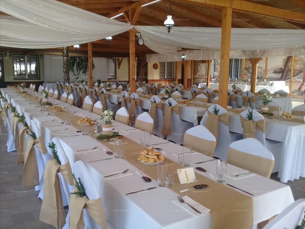 4. Esküvők és Rendezvények: Az étterem ideális esküvők, rendezvények számára, fedett terasz és gondozott udvaron, kerti tó mellett.