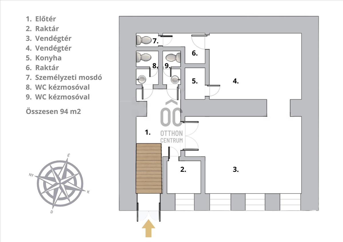 - Jelenlegi felosztása: előtér, két vendégtér, konyha, raktár, két vendégmosdó kézmosóval, személyzeti raktár, személyzeti mosdó.