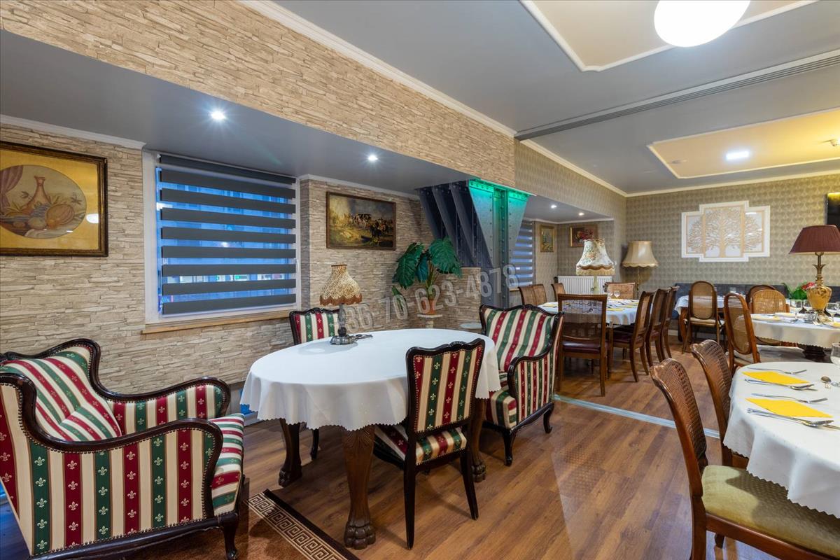 A 167 nm-es földszinti rész jelentős részét a 60 főt egyszerre befogadó svédasztalos vendégtér foglalja el. De természetesen itt van a mindennel felszerelt konyha (2 db 6-os főzőlap, 1 méteres rostlap, 6 tálcás sütő, sokkoló, 3 fritőz, stb. ) És a hozzá tartozó rengeteg kiszolgáló helység: a hús- és zöldség feldolgozók, 2 hűtőkamra, bárpult, melegen tartók, tálalók, stb…