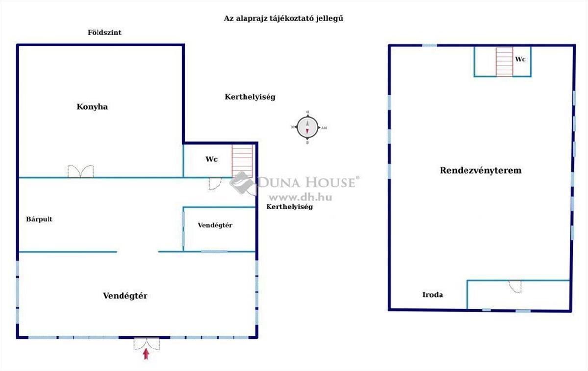 Az épület 2 szintes, a földszinten 50-55 fő leültetésére alkalmas étterem helyezkedik el, ugyanezen a szinten kiszolgáló pult, konyha, valamint szociális helyiségek kerültek kialakításra.