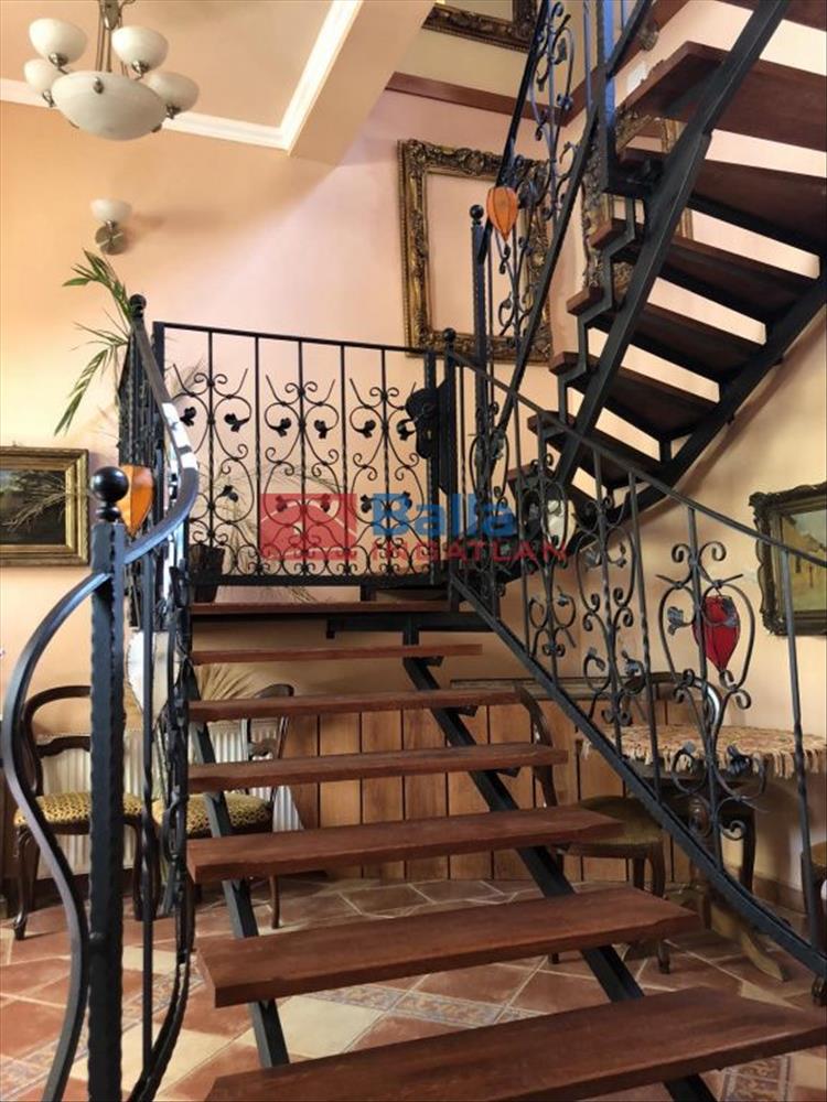 A földszinten egy előtérbe érkezünk, ahol egy csodálatos belső lépcső vezet az emeletre. a lépcső tölgyfából és kovácsoltvasból készült, ami ékessége az egész épületnek, csak úgy mint a korhű burkolatok, intarziás parketta, fa oszlopok. Minden a modern és a régi kor összhangjáról tanúskodik.
