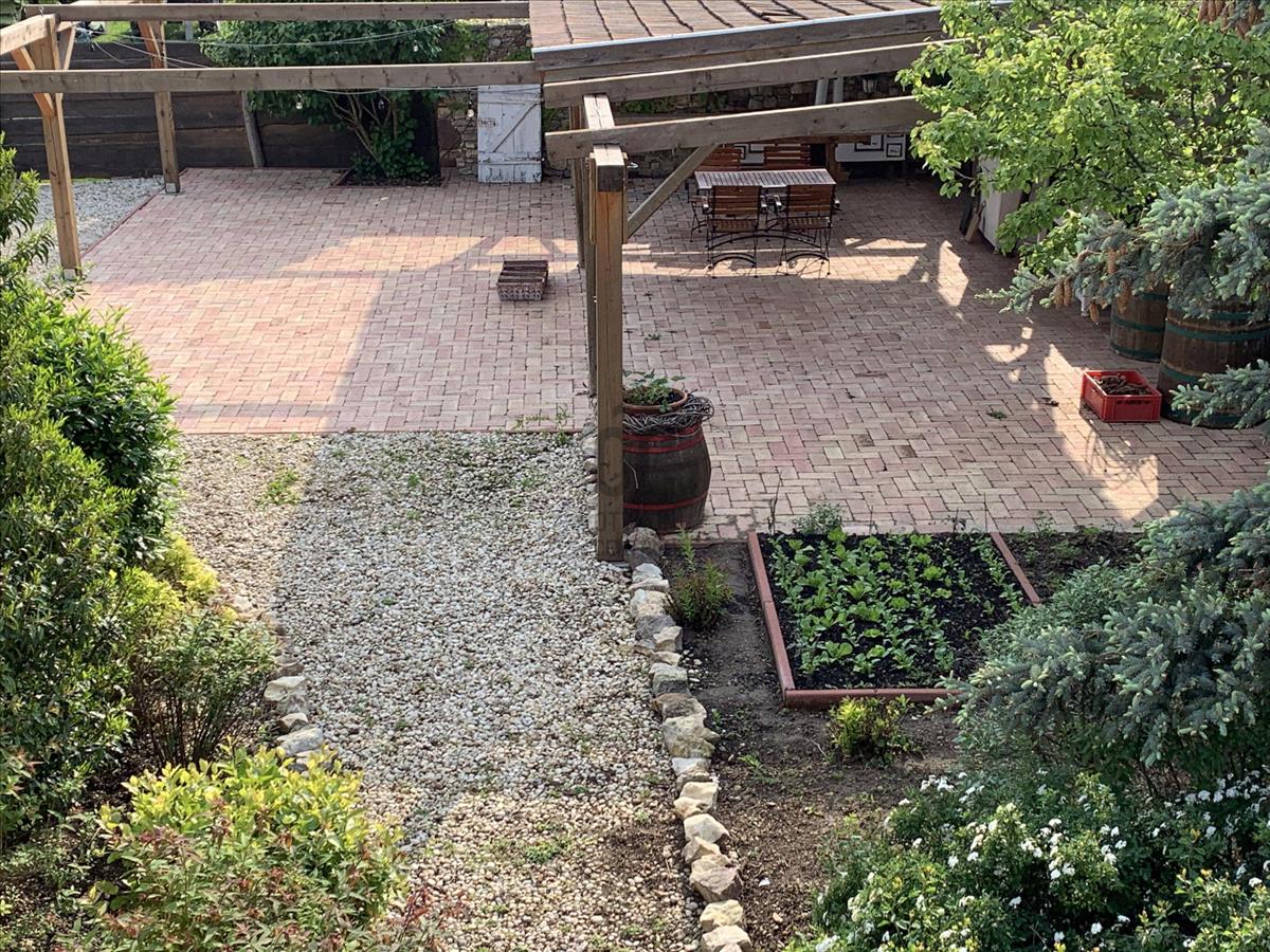 A családi/ baráti összejövetelekhez, sütögtésekhez pedig egy hatalmas, vöröskő fallal körülölelt pergola biztosít megfelelő helyszínt.