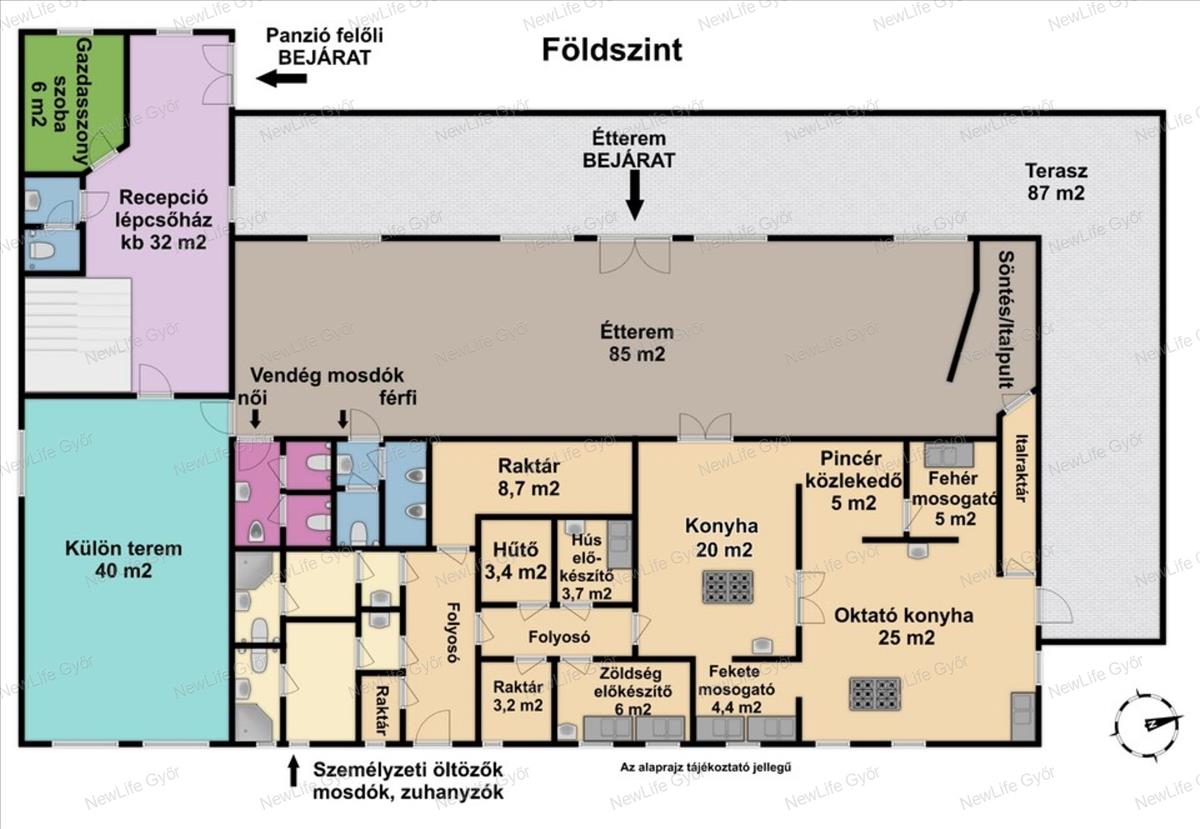 földszint: 286 m2, ebből étterem: 85 m2 (max. : 80 Fő), különterem: 40 m2 (max. : 40 Fő), belmagasság: 3, 12 m