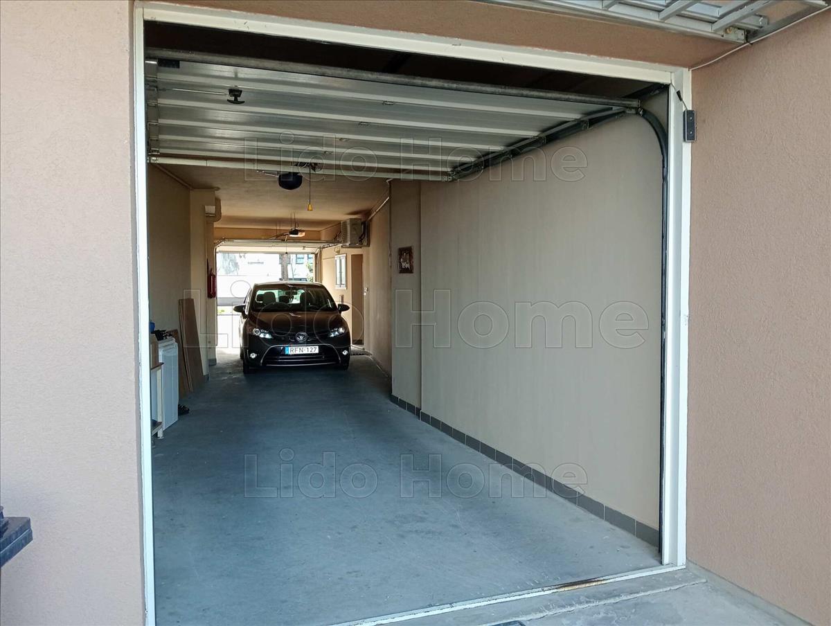 A házhoz tartozik egy fedett terasz, amelyet elektromos garázskapuk zárnak le, biztosítva a védett parkolást 8-10 autó számára.