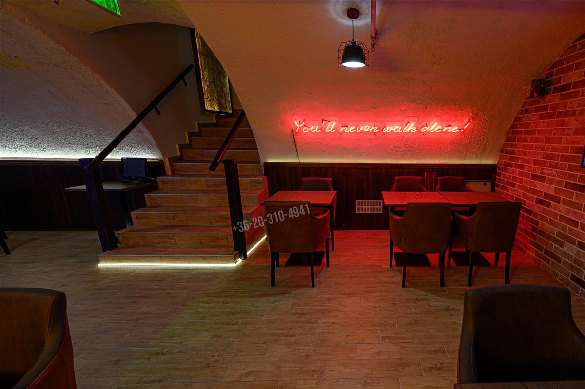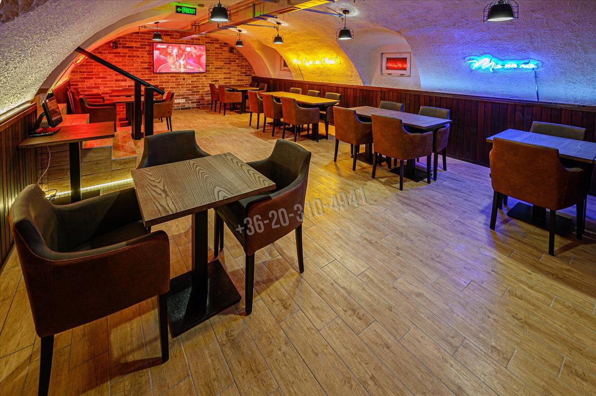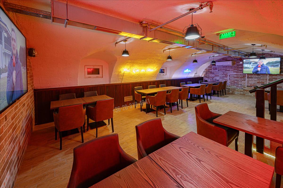 Az ingatlan összesen 186m2 területű, mely belső 2 szinten helyezkedik el. a földszinten megtalálható a vendégtér, a kiszolgálópult, mely egy része felett galéria került kialakításra (iroda, öltöző helyiséggel), konyha és a vendég mosdók. a pince szinten egy nagyobb méretű vendégtér, és egy 8 fős vip különterem kapott helyet.