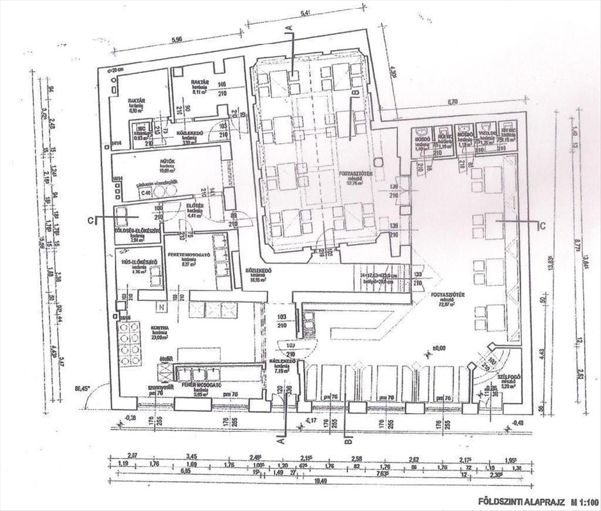 A földszinten éttermi konyha található a hozzá tartozó kiszolgáló helyiségekkel, két vendégtérrel, melyek 80 fő befogadására alkalmasak (240 m2).