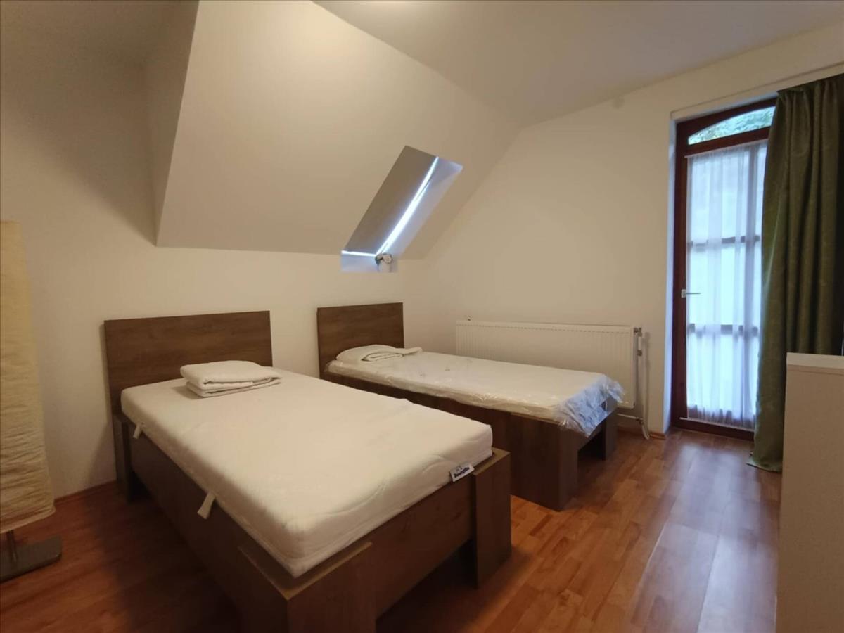 2. Szint / panzió rész: amerikai konyhás nappali, ágyak a nappaliban, innen nyíló kétágyas és háromágyas szobák, mindegyikhez saját fürdőszoba zuhanyzóval és WC-vel, valamint erkély vagy kis teraszkapcsolat.