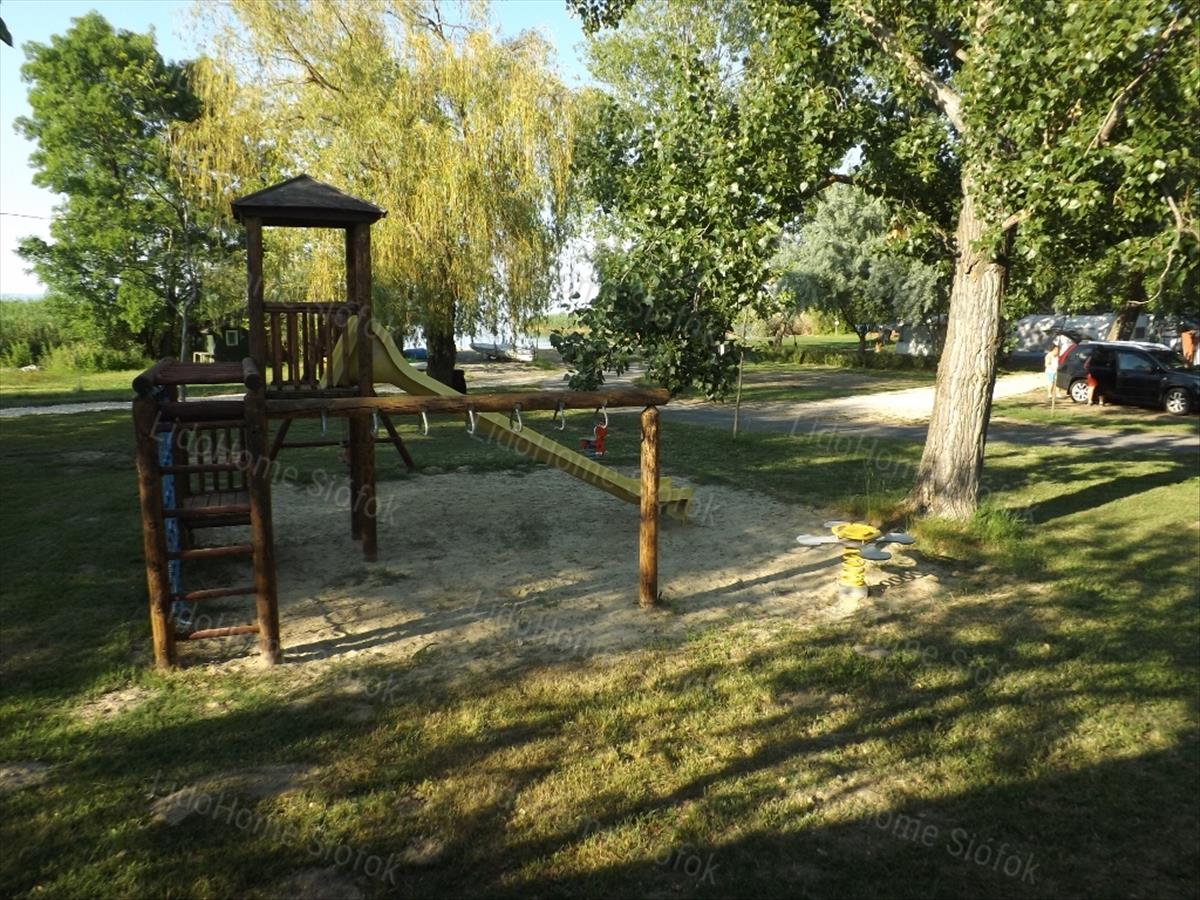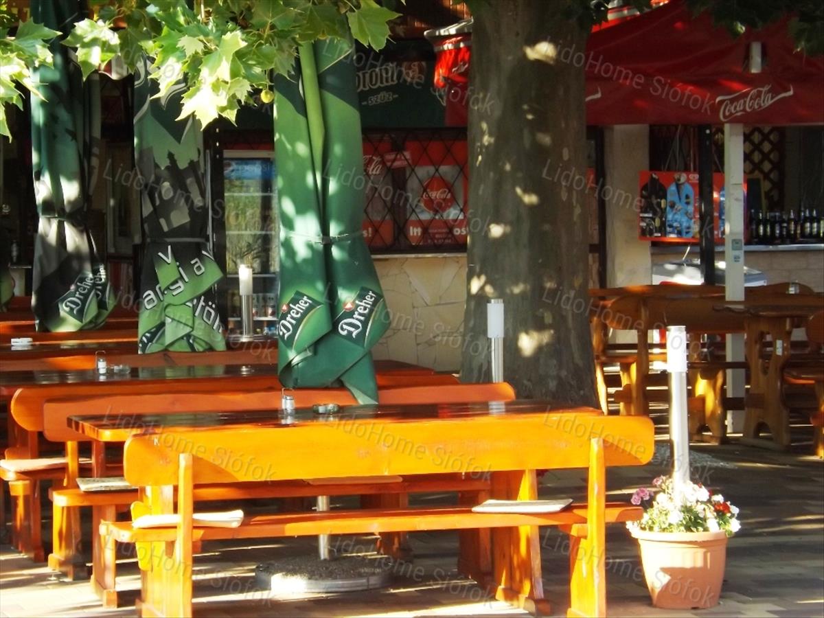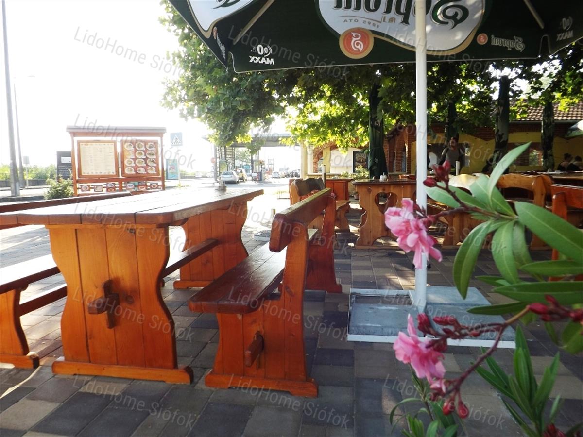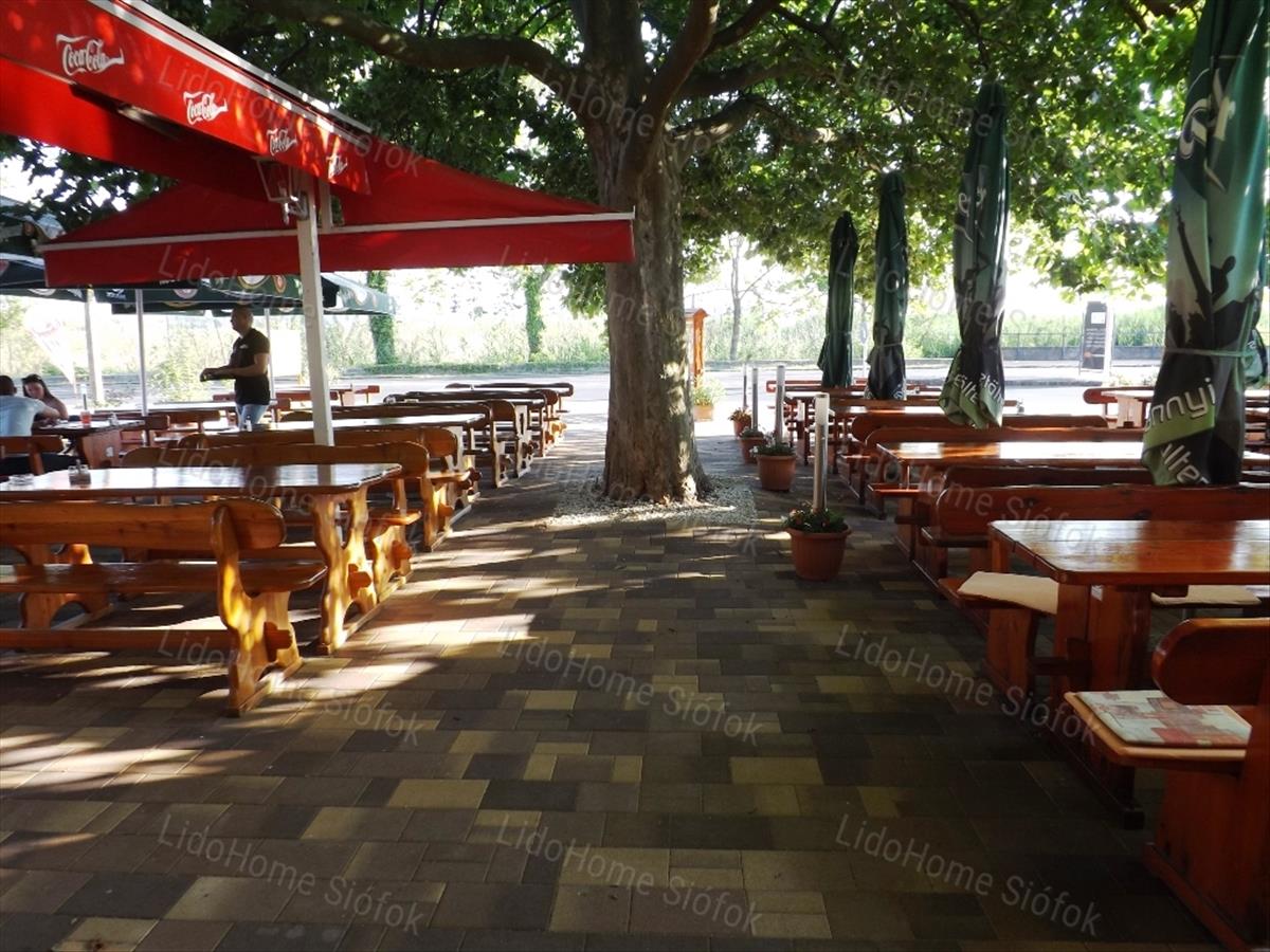 -Az ingatlanhoz 637nm-es saját telek tartozik, melyből az üzlet előtt egy nagy platánfa ad árnyékot az idén térkövezett kerthelyiségnek. Ez szintén teljesen berendezett, jó minőségű fa sörpadokkal, napernyőkkel, kilátással a Balatonra. 100-120 Fő kényelmesen elfér.