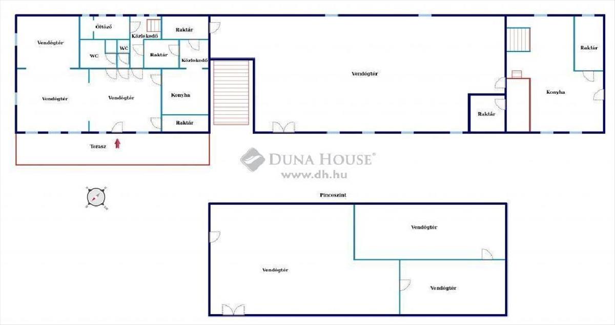 A saroktelken elhelyezkedő ingatlan egyik oldalán árnyékos terasz fut végig, melyről a világos étterembe lépünk be, illetve ezen a szinten található egy hatalmas különterem is, ami fénykorában esküvők, rendezvények színhelye volt.