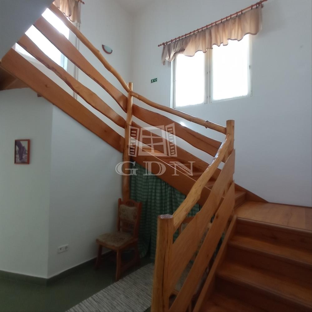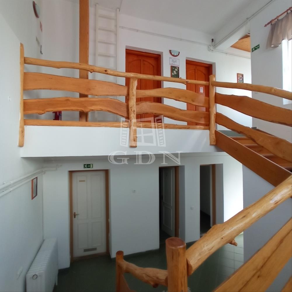 Az alsó szinten található az étkező (20 fő), konyha, iroda, mosókonyha, 2 mosdó.