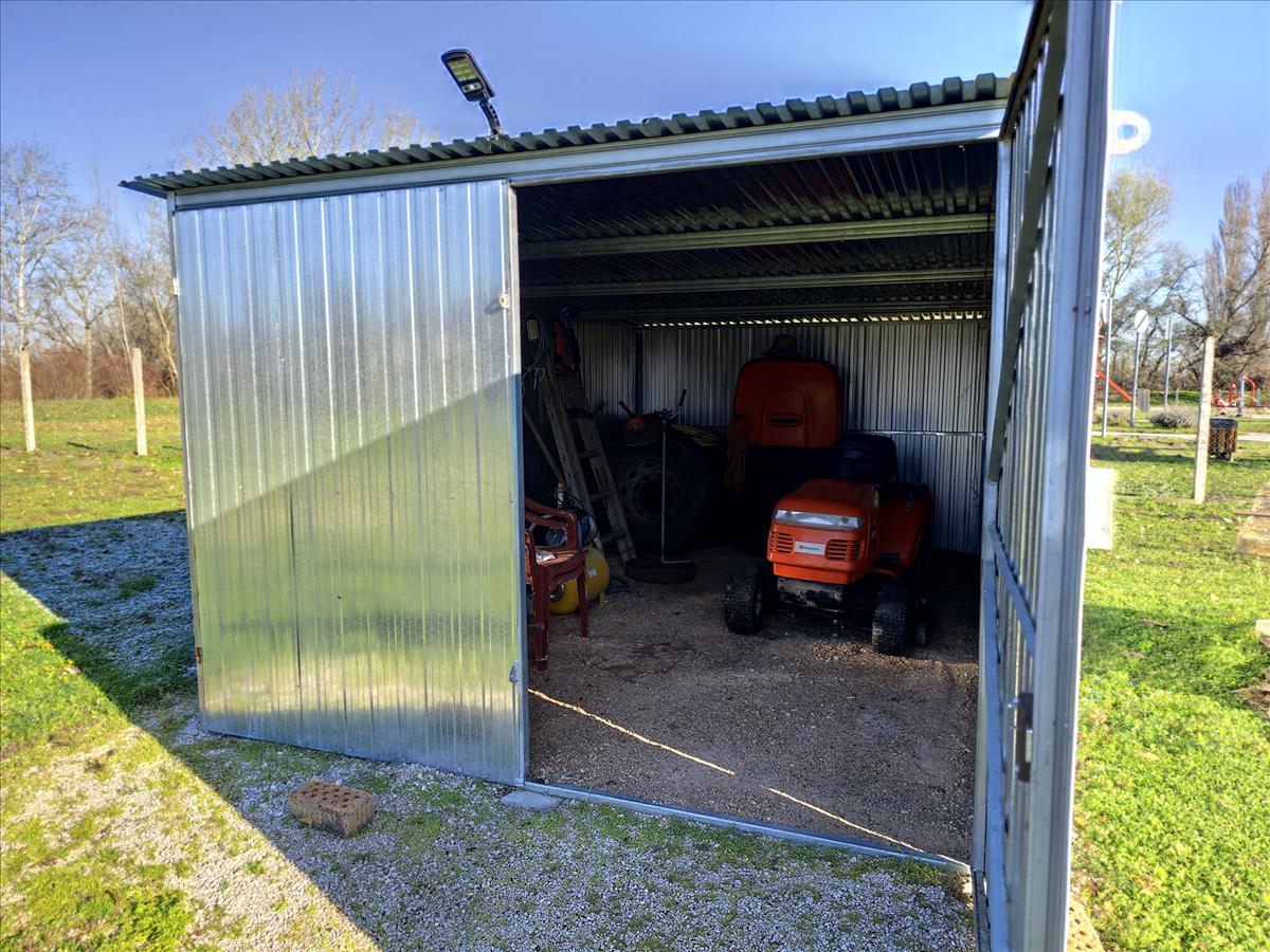 A telken található egy 3m x 6m-es lemez mobilgarázs.