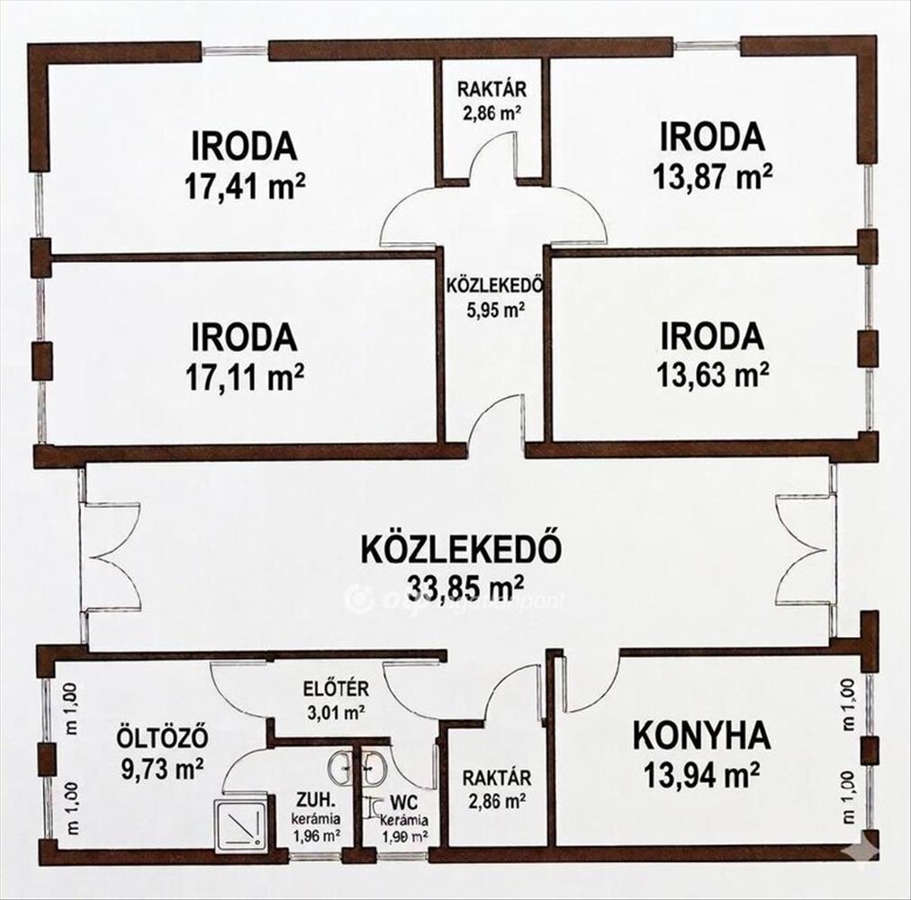 -Irodák: 4 különálló, világos irodahelyiség (13, 6 m2 - 17, 4 m2 között).